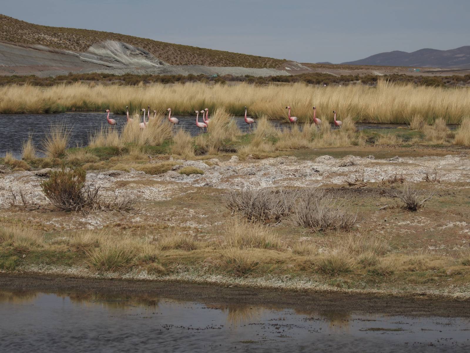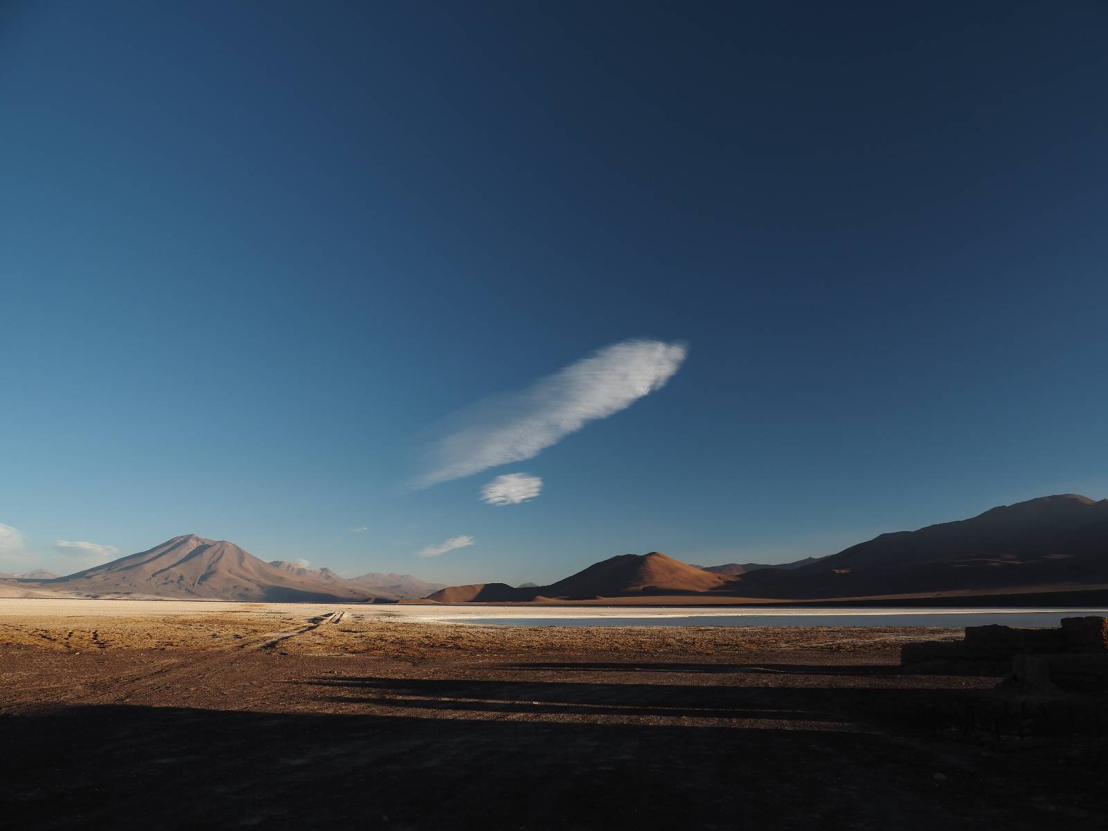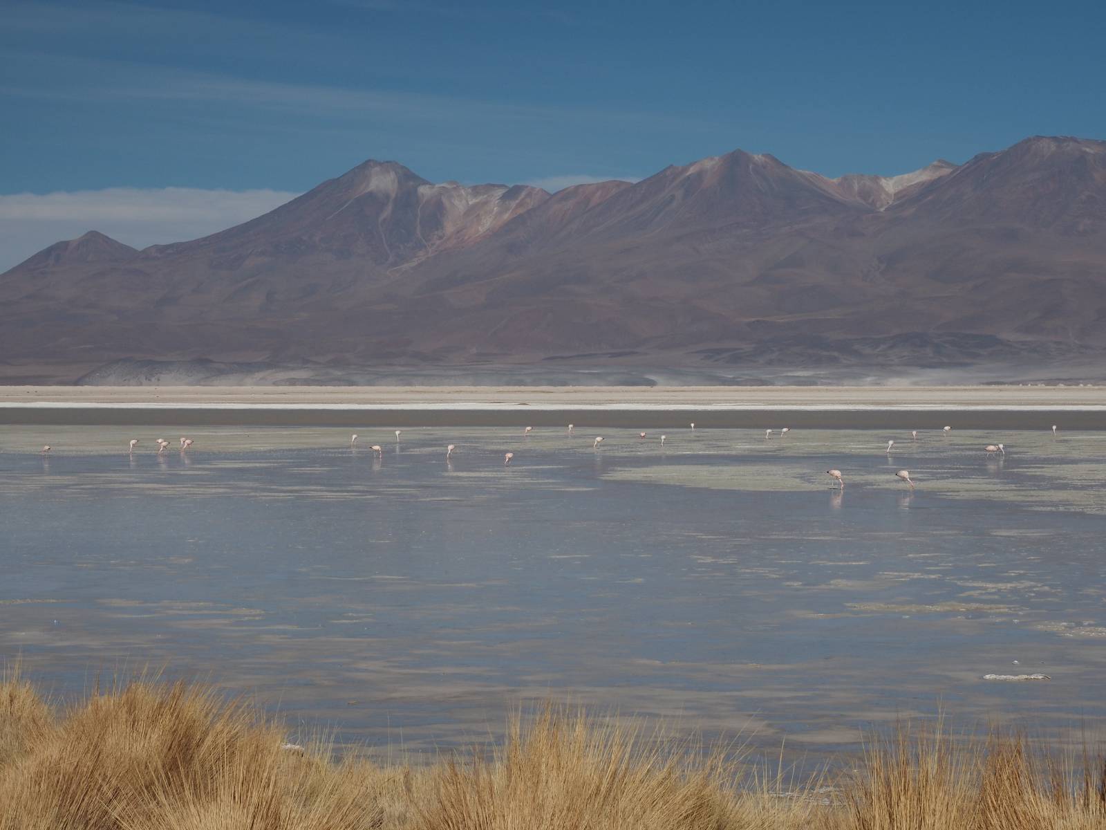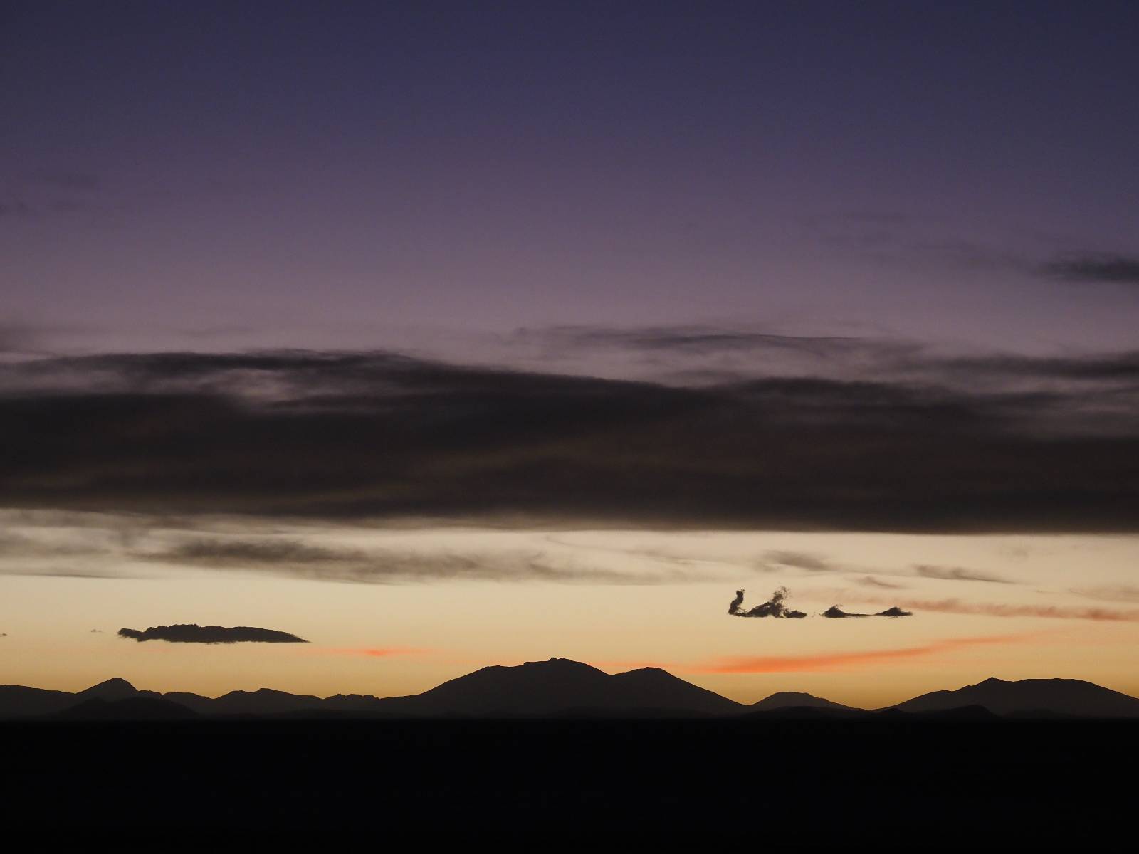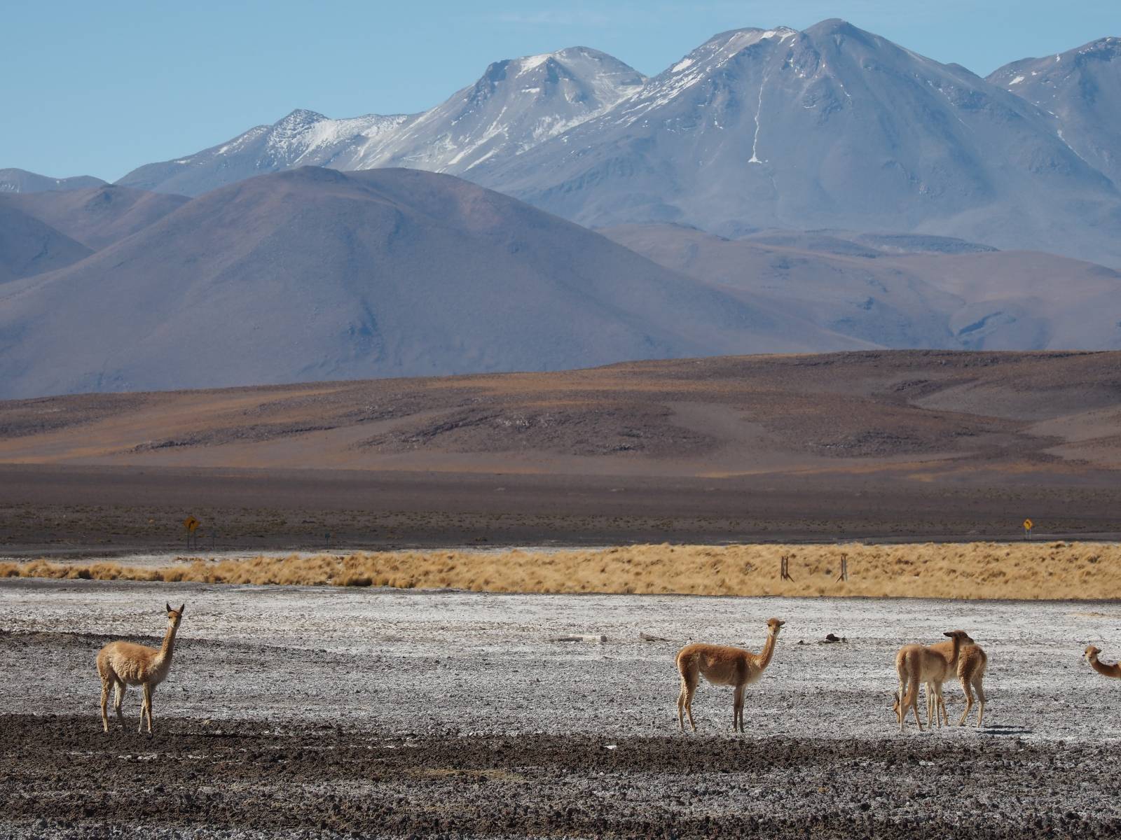 Ich habe San Pedro hinter mir gelassen. Da ich nun nicht die Laguna Route nehe fahre ich nach einem Tankstopp in Calama weiter zur Grenze nach Ollaguë. Auch wenn es nicht die Abenteuerstraße ist, so gibt es trotzdem viel zu staunen. Seicht und langsam werde ich immer höher geführt von ca 2600m in San Pedro auf erstmal ca. 3700m in Ollaguë. Aber wie das so ist, zum einen habe ich ja schon die ersten 100km bis Calama hinter mir, so dass es schon Nachmittag ist und zum anderen halte ich natürlich wieder andauernd an. Bis ich ich zum Salar Ascotan komme. Auch hier, wie schon auf der ganzen Strecke sensationelle Natur. Ich beobachte die hiesiegen Rehe, wie sie über den Salzsee an mir vorbeilaufen und wundere mich gerade wieder, wie sie es schaffen hier oben zu überleben! Ein Stückchen weiter Flamungos äh, Flamingos! Ich denke an Jessi und versuche sie sogar mit dem Tele zu kriegen! Und natürlich bietet sich mir ein neuer Hauseingang an. Ich habe keine Lust mehr bis zur Grenze zu hetzen. Ich habe wieder drei Wände, die mich vor Wind schützen und diesmal darf ich sogar das Motorrad mit rein nehemen. Schräg aber ich habe Netz! Und so kann ich von der sich minütlich ändernden Abendstimmung ein paar Bilder in den Status stellen. So stolpere ich hin und her zwischen Zelt bauen, kochen und Fotos und Videos machen…und… ich hatte eine unglaubliche Nacht…