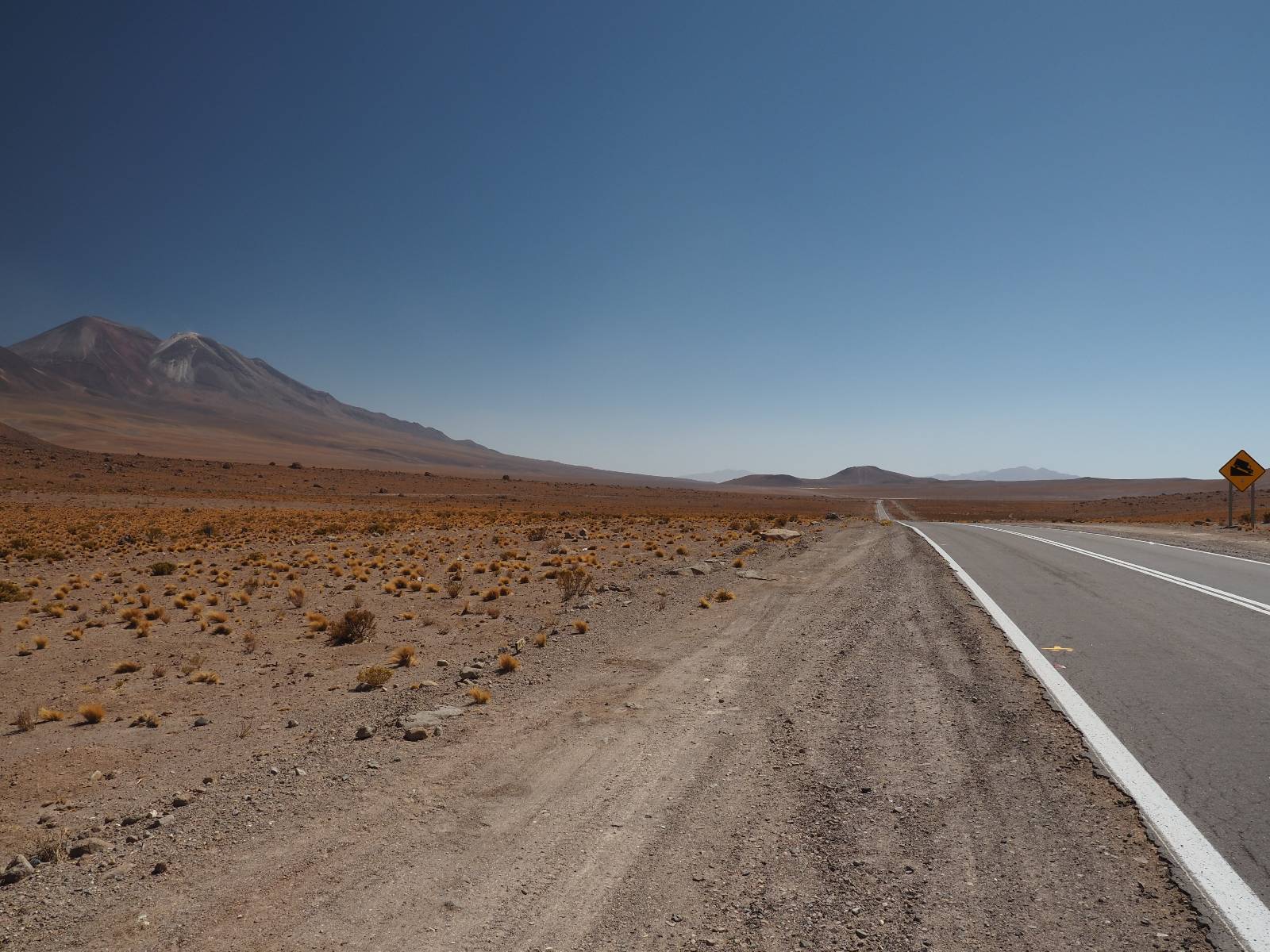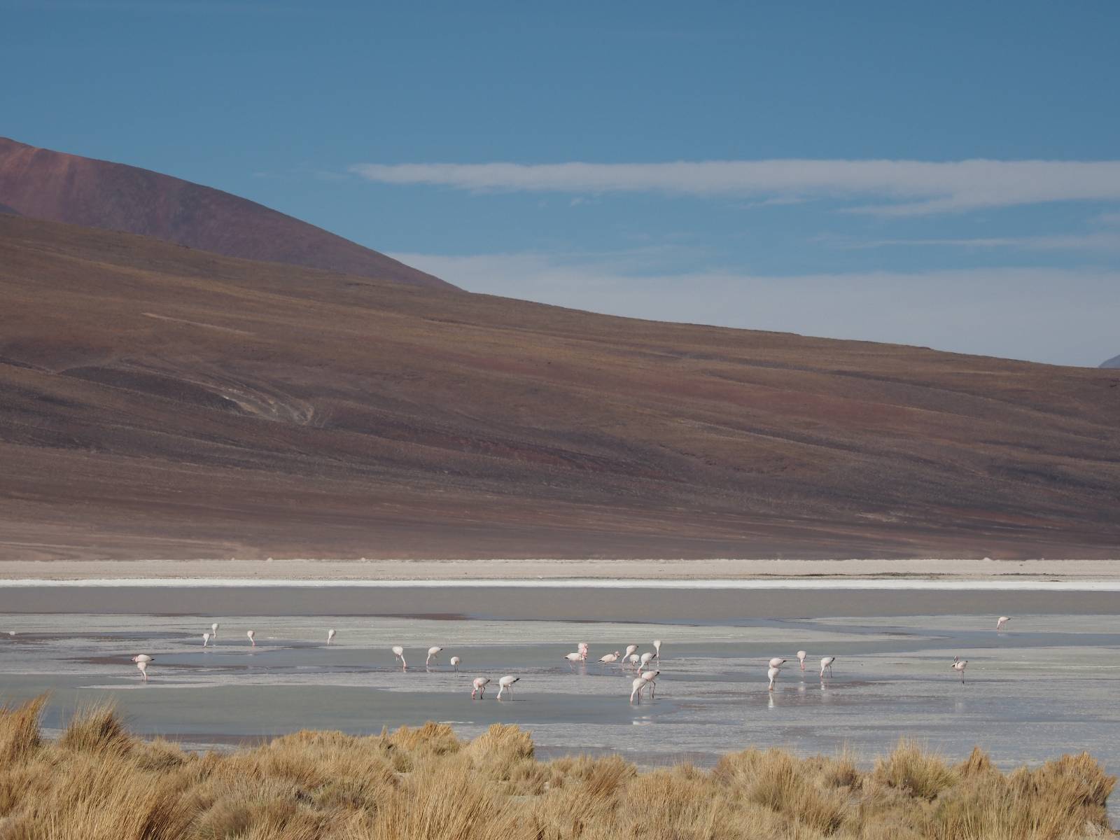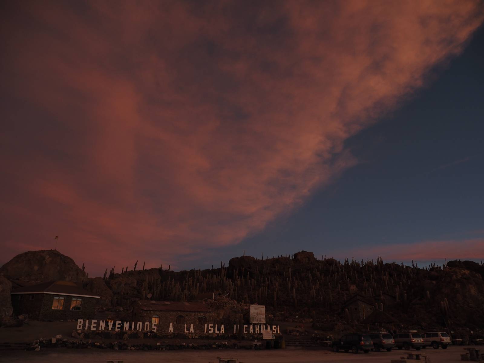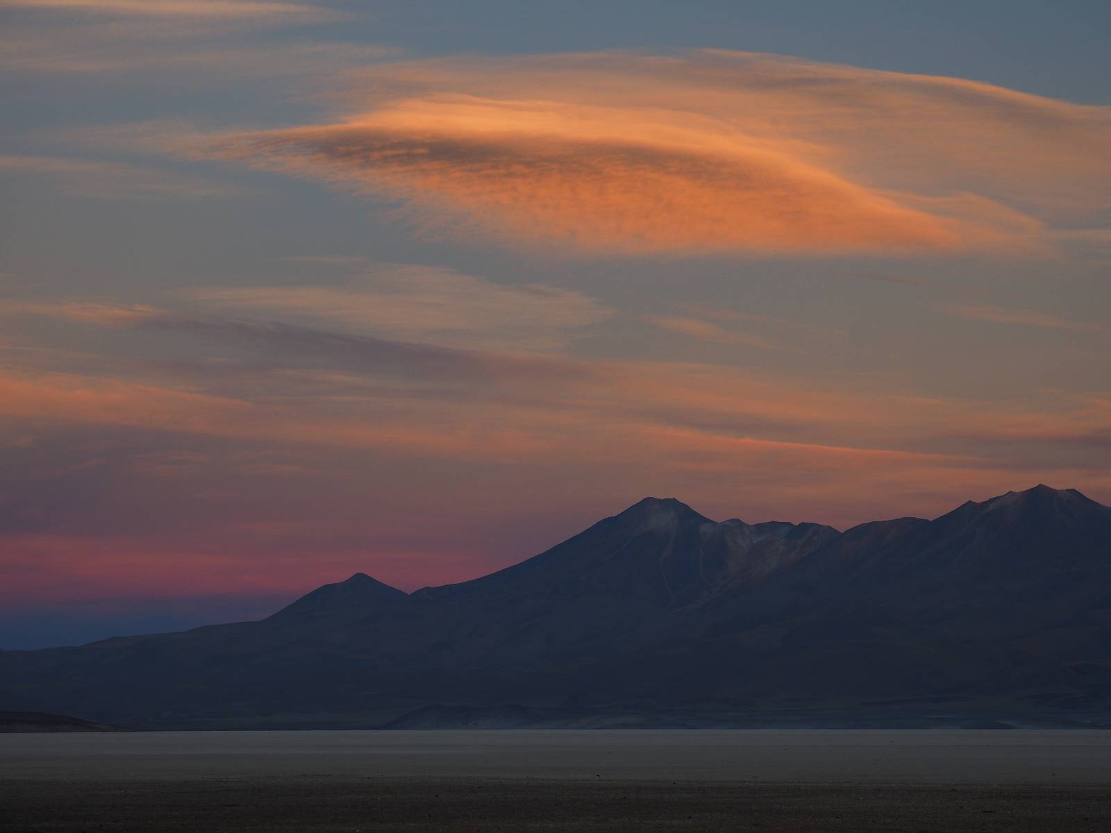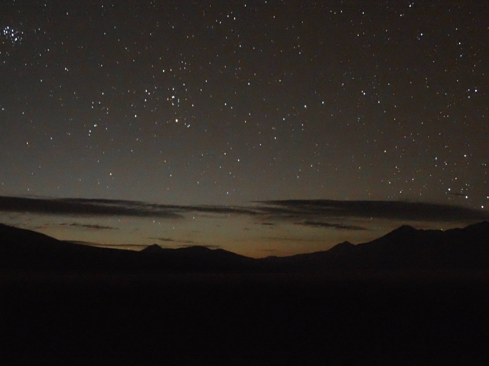 Ich habe San Pedro hinter mir gelassen. Da ich nun nicht die Laguna Route nehe fahre ich nach einem Tankstopp in Calama weiter zur Grenze nach Ollaguë. Auch wenn es nicht die Abenteuerstraße ist, so gibt es trotzdem viel zu staunen. Seicht und langsam werde ich immer höher geführt von ca 2600m in San Pedro auf erstmal ca. 3700m in Ollaguë. Aber wie das so ist, zum einen habe ich ja schon die ersten 100km bis Calama hinter mir, so dass es schon Nachmittag ist und zum anderen halte ich natürlich wieder andauernd an. Bis ich ich zum Salar Ascotan komme. Auch hier, wie schon auf der ganzen Strecke sensationelle Natur. Ich beobachte die hiesiegen Rehe, wie sie über den Salzsee an mir vorbeilaufen und wundere mich gerade wieder, wie sie es schaffen hier oben zu überleben! Ein Stückchen weiter Flamungos äh, Flamingos! Ich denke an Jessi und versuche sie sogar mit dem Tele zu kriegen! Und natürlich bietet sich mir ein neuer Hauseingang an. Ich habe keine Lust mehr bis zur Grenze zu hetzen. Ich habe wieder drei Wände, die mich vor Wind schützen und diesmal darf ich sogar das Motorrad mit rein nehemen. Schräg aber ich habe Netz! Und so kann ich von der sich minütlich ändernden Abendstimmung ein paar Bilder in den Status stellen. So stolpere ich hin und her zwischen Zelt bauen, kochen und Fotos und Videos machen…und… ich hatte eine unglaubliche Nacht…