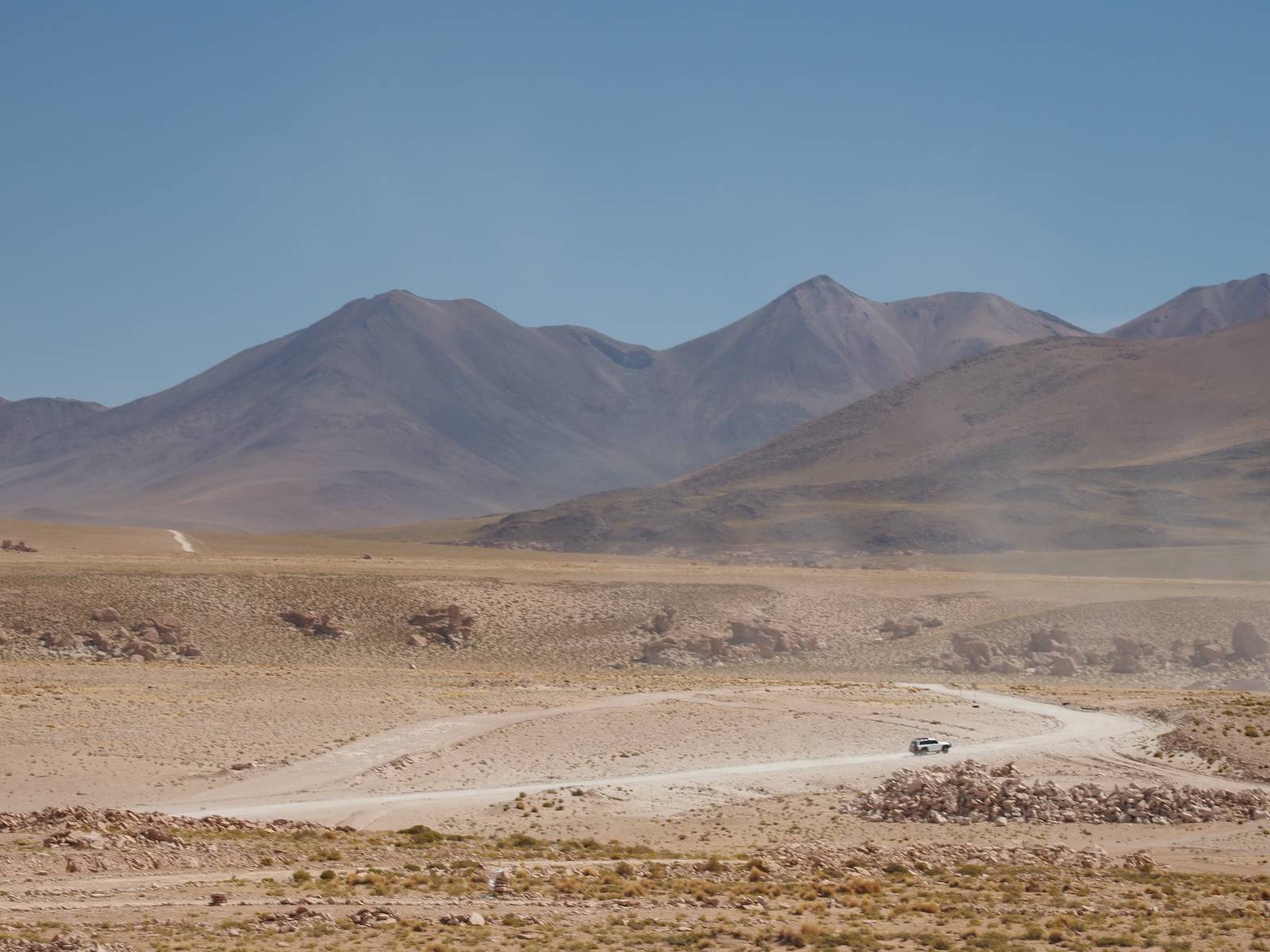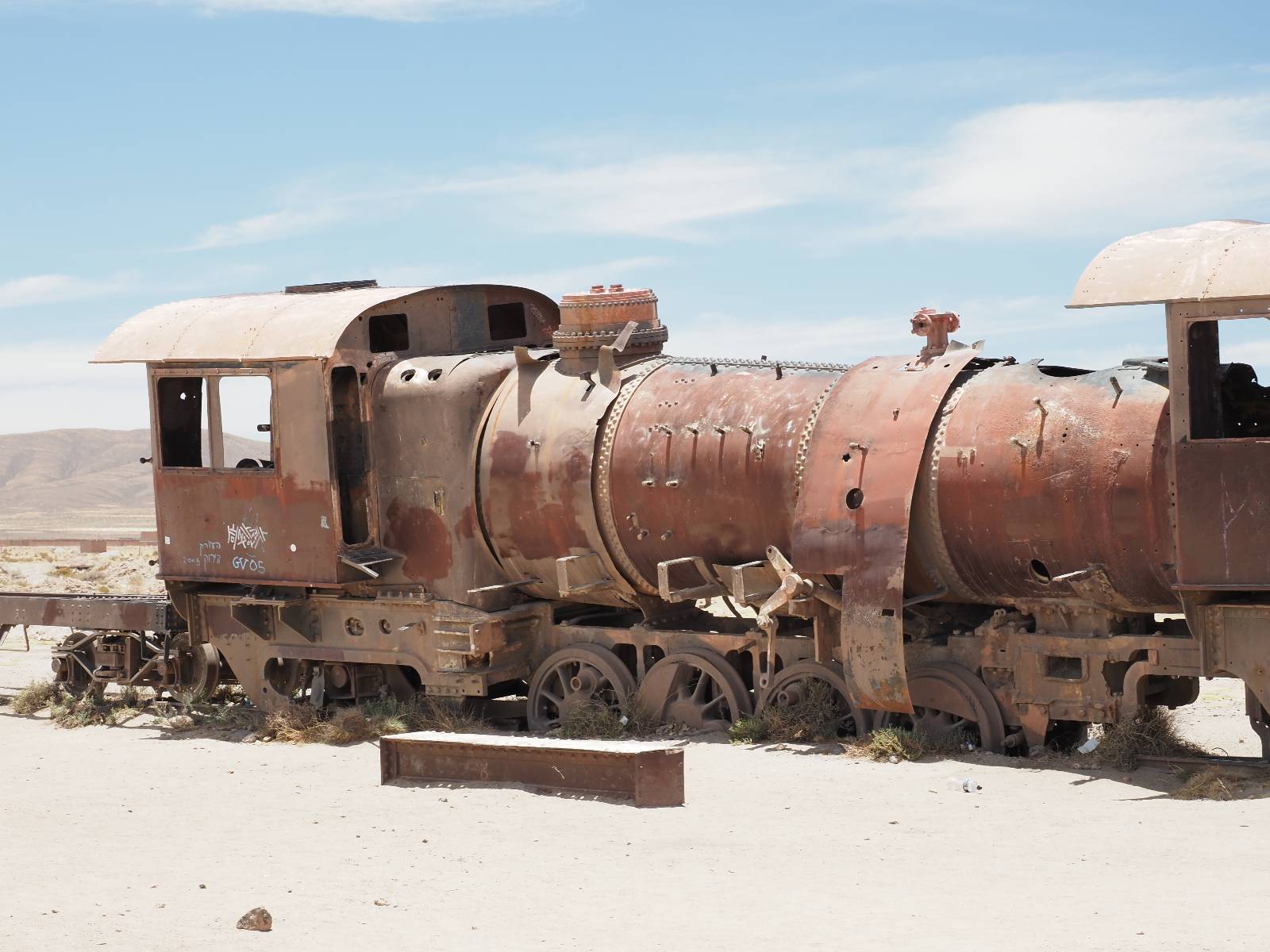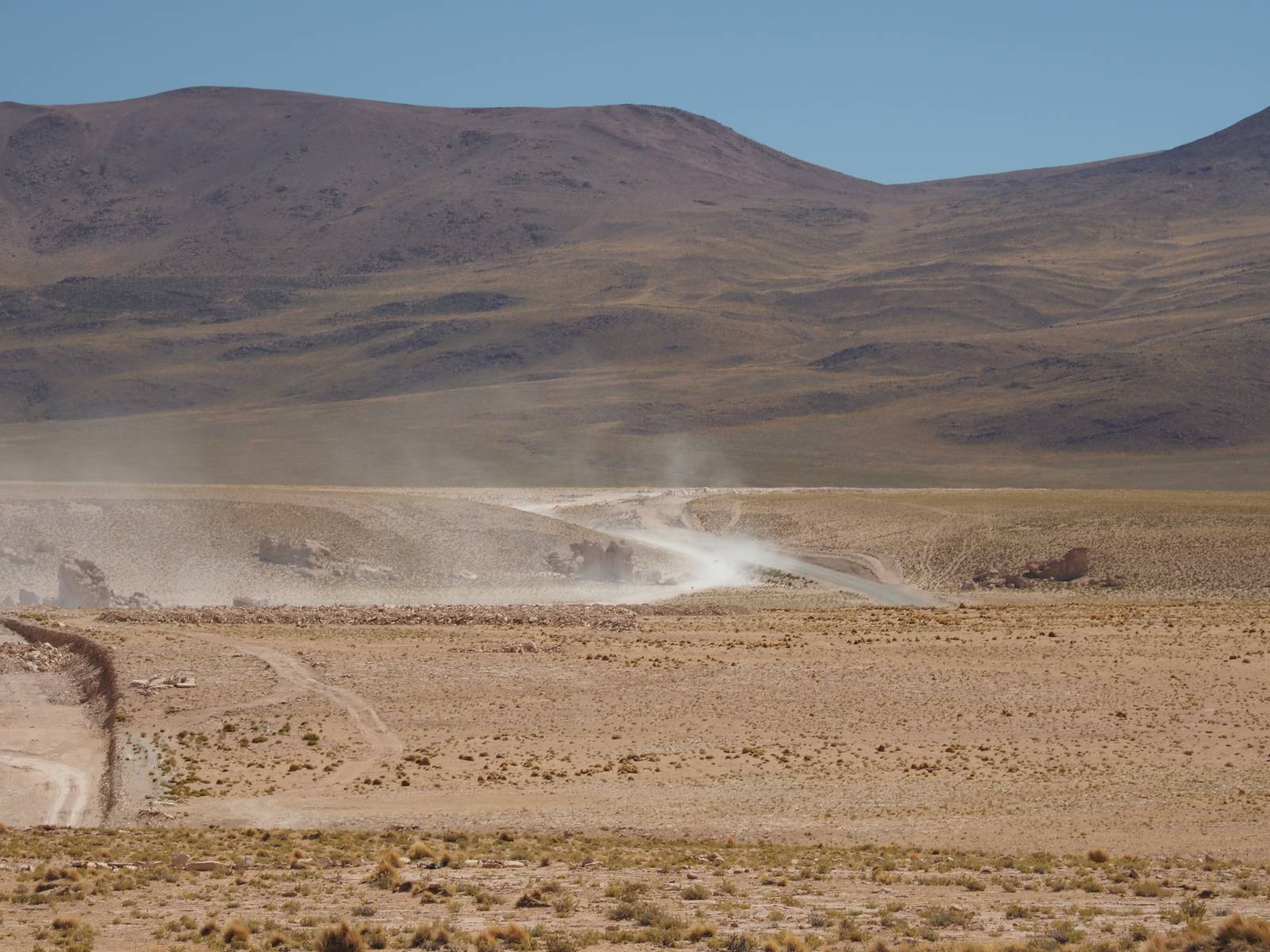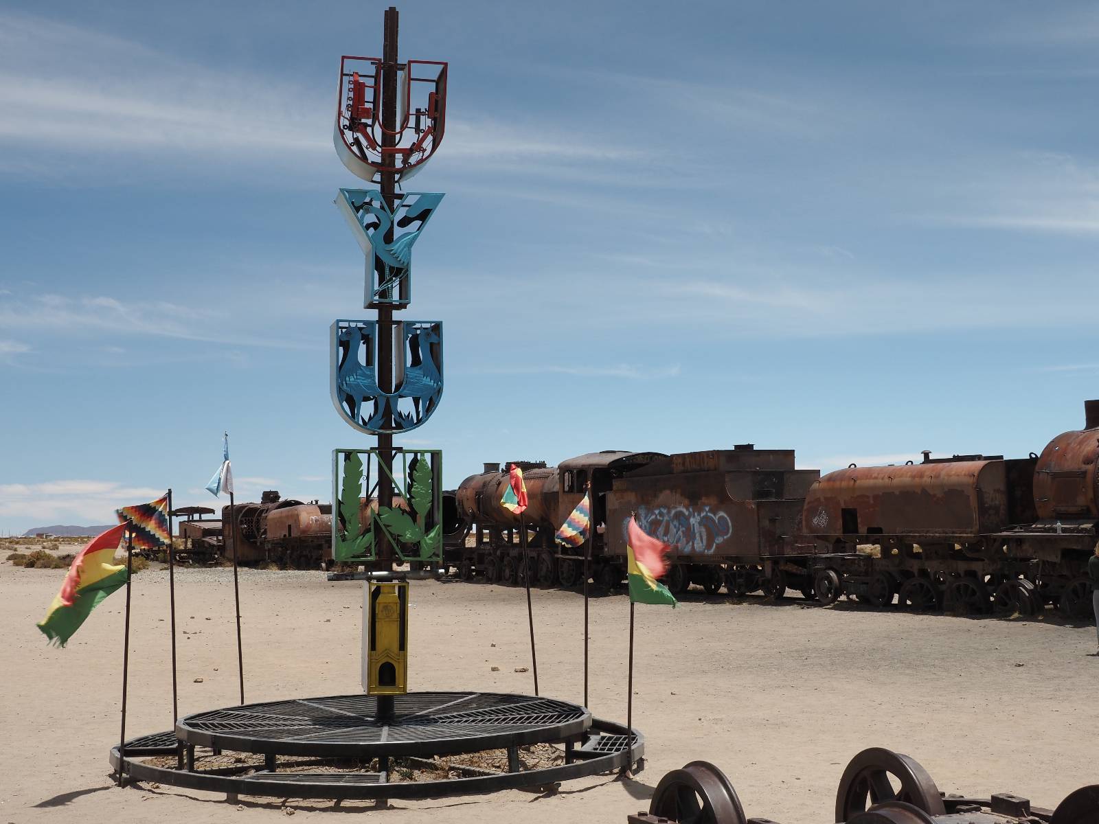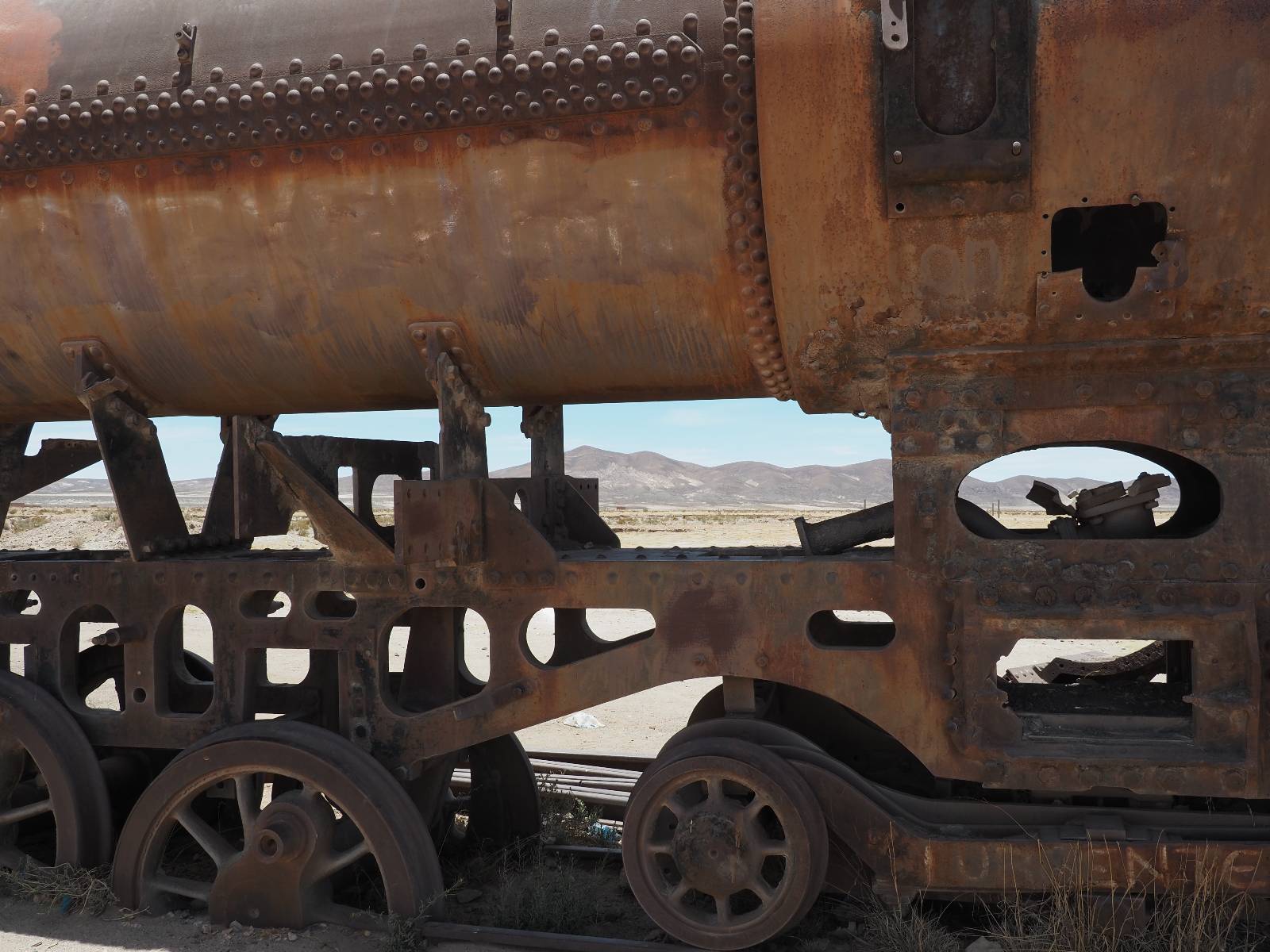 Am nächsten Morgen die übliche Routine! Nach dem ich mich auf den Weg gemacht habe komme ich in Ollaguë an. Wieder so ein verlassen anmutender Ort, wo sich um 12:00 Uhr mittags die vertrockneten Wüstenbüsche vom Wind über die Straßen treiben lassen. Ich frage nach einem Restaurant und finde letztendlich eine kleine Bude und bekomme dort ein ganz leckere Suppe mit Reis, Kartoffel und einem Stückchen Huhn. Ich bin gerade fertig als scheinbar einige Grenzgänger aus Bolivien eintreffen und die drei Tische fast keinen Platz mehr bieten. Ich mache meinen Platz frei und bewege mich an die Grenze. Erst aus Chile raus, dann ein zwei km weiter in Bolivien wieder rein. Ich bin nicht der einzige Ausländer und Motorradfahrer, der auf eine andere Seite will. Bolivien möchte das Einreiseformular online und bieten dafür sogar Wlan an. Doch das Sch…ding will sich nicht speichern lassen! Nach dem gefühlt 10. Versuch und nachdem ich wirklich alle Leerzeichen, versehentliche und beim Kennzeichen gewollte, entfernt habe und trotzdem die Fehlermeldung kommt, speichert es das Formular dann doch. Nach geschätzen ein einhalb Stunden bin ich in Bolivien und nehme Kurs auf Uyuni. Auch hier nehme ich die Hauptstraße! Hier und da gibt es noch etwas Befestigung, ansonsten viele Löcher, Sand und vor allem Staub! Staub der von den LKW aufgewirbelt wird die volle Kanne mir entgegengepest kommen. Ich gehe davon aus, dass die meisten leer zurückkommen und eher von Chile aus Bolivien mit Sprit und ähnlichem versorgen. Ein Loch sehe ich zu spät, bzw. kann ihm nicht mehr ausweichen. Eigentlich sieht es nicht so schlimm aus aber die Touratech-Suspension kommt zumindest vorn an ihre Grenzen und schlägt einmal durch und ich mache einen Hüpfer! Trotz der vielen LKW, die mir doch ganz gut Aufmerksamkeit abfordern, bin ich begeistert von der Landschaft! Es wird gefühlt grüner, die Felsen ändern sich und die Vulkane, von denen der ein oder andere sich eine Pafft, sind beeindruckend! Laut Navi soll ich um ca. 18:00 Uhr ankommen, doch es ist 18:00, was zum Teufel macht das Navi nun schon wieder und ich habe noch 80km zu fahren, also über eine Stunde!! So hatte ich nicht gewettet! Da hätte ich mir vielleicht doch noch einen netten Zeltplatz gegönnt! Ich hatte ein zwei schöne stellen gesehen. Irgend was stimmt da wieder nicht! Ich reite kurz nach 19:00 Uhr in Uyuni ein. Eine karrierte, langweilig, rechteckig aufgeteilte Stadt erwartet mich. Die wichtigsten Hauptstraßen sind mal nicht aus Sand… Ich halte, mein Netz funktioniert und ich schaue was es an Unterkünften gibt. Das erste Hostal ist ausgebucht. Ich fahre zum nächsten und bekomme ein großes Zimmer mit eigenem Bad, Parkplatz um die Ecke für 15BOB’s. Ich finde Zeit, um mal zu schauen, warum das Navi schon wieder gesponnen hat. Hat es aber nicht! Diesmal war es korrekt und ich muss feststellen, dass Bolivien eine Stunde mehr Zeitunterschied hat. Uyuni selber finde ich nicht so sehr aufregend. Es gibt ein kleines Stadtzentrum, wo man alles findet, eine große Hauptstraße und etwas weiter weg wird es einfach staubig. Ich wechsele EUR in BOB in einer Wechselstube und bekomme etwas mehr als den offiziellen Kurs. Ich hatte vorher mal nach Blue Dollar Bolivien geschaut, da wäre es 1:12 statt der offiziellen ca. 1:8 gewesen. Ich bekomme an der besten Stube 1:10 aber nur wenn ich große Scheine ab 50 EUR aufwärts benutze, sonst 1:9. Ich gönne mir den nächsten Tag, um etwas durch die nähere Umgebung zu laufen, mir die Märkte anzusehen und letztendlich den letzten Eintrag zu schreiben.