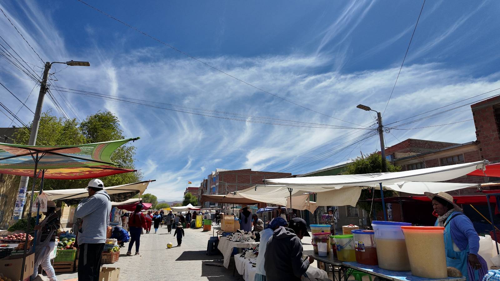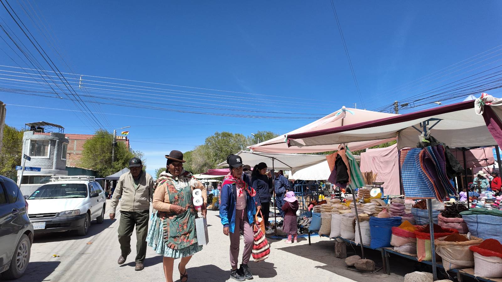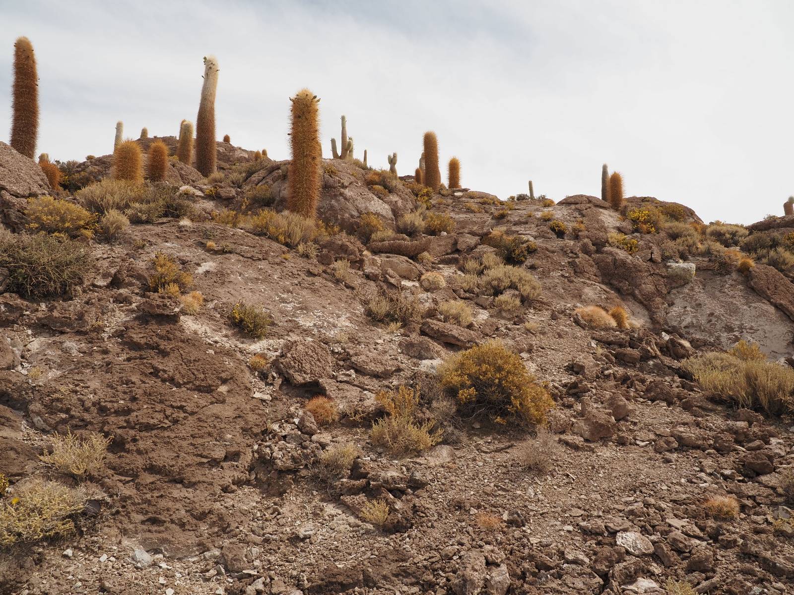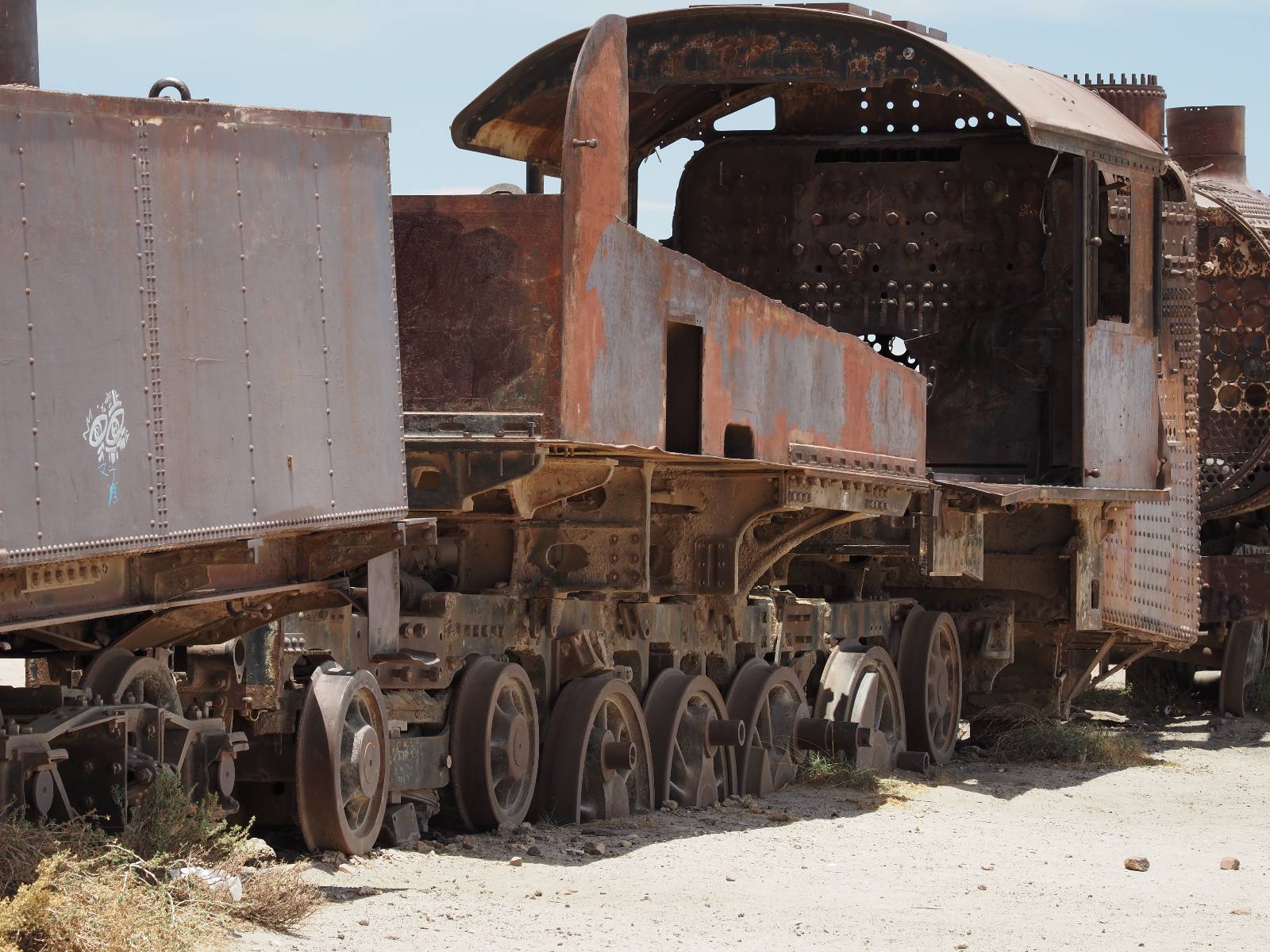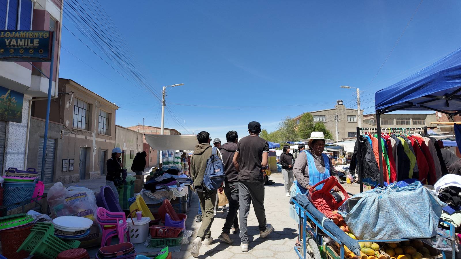 Am nächsten Morgen die übliche Routine! Nach dem ich mich auf den Weg gemacht habe komme ich in Ollaguë an. Wieder so ein verlassen anmutender Ort, wo sich um 12:00 Uhr mittags die vertrockneten Wüstenbüsche vom Wind über die Straßen treiben lassen. Ich frage nach einem Restaurant und finde letztendlich eine kleine Bude und bekomme dort ein ganz leckere Suppe mit Reis, Kartoffel und einem Stückchen Huhn. Ich bin gerade fertig als scheinbar einige Grenzgänger aus Bolivien eintreffen und die drei Tische fast keinen Platz mehr bieten. Ich mache meinen Platz frei und bewege mich an die Grenze. Erst aus Chile raus, dann ein zwei km weiter in Bolivien wieder rein. Ich bin nicht der einzige Ausländer und Motorradfahrer, der auf eine andere Seite will. Bolivien möchte das Einreiseformular online und bieten dafür sogar Wlan an. Doch das Sch…ding will sich nicht speichern lassen! Nach dem gefühlt 10. Versuch und nachdem ich wirklich alle Leerzeichen, versehentliche und beim Kennzeichen gewollte, entfernt habe und trotzdem die Fehlermeldung kommt, speichert es das Formular dann doch. Nach geschätzen ein einhalb Stunden bin ich in Bolivien und nehme Kurs auf Uyuni. Auch hier nehme ich die Hauptstraße! Hier und da gibt es noch etwas Befestigung, ansonsten viele Löcher, Sand und vor allem Staub! Staub der von den LKW aufgewirbelt wird die volle Kanne mir entgegengepest kommen. Ich gehe davon aus, dass die meisten leer zurückkommen und eher von Chile aus Bolivien mit Sprit und ähnlichem versorgen. Ein Loch sehe ich zu spät, bzw. kann ihm nicht mehr ausweichen. Eigentlich sieht es nicht so schlimm aus aber die Touratech-Suspension kommt zumindest vorn an ihre Grenzen und schlägt einmal durch und ich mache einen Hüpfer! Trotz der vielen LKW, die mir doch ganz gut Aufmerksamkeit abfordern, bin ich begeistert von der Landschaft! Es wird gefühlt grüner, die Felsen ändern sich und die Vulkane, von denen der ein oder andere sich eine Pafft, sind beeindruckend! Laut Navi soll ich um ca. 18:00 Uhr ankommen, doch es ist 18:00, was zum Teufel macht das Navi nun schon wieder und ich habe noch 80km zu fahren, also über eine Stunde!! So hatte ich nicht gewettet! Da hätte ich mir vielleicht doch noch einen netten Zeltplatz gegönnt! Ich hatte ein zwei schöne stellen gesehen. Irgend was stimmt da wieder nicht! Ich reite kurz nach 19:00 Uhr in Uyuni ein. Eine karrierte, langweilig, rechteckig aufgeteilte Stadt erwartet mich. Die wichtigsten Hauptstraßen sind mal nicht aus Sand… Ich halte, mein Netz funktioniert und ich schaue was es an Unterkünften gibt. Das erste Hostal ist ausgebucht. Ich fahre zum nächsten und bekomme ein großes Zimmer mit eigenem Bad, Parkplatz um die Ecke für 15BOB’s. Ich finde Zeit, um mal zu schauen, warum das Navi schon wieder gesponnen hat. Hat es aber nicht! Diesmal war es korrekt und ich muss feststellen, dass Bolivien eine Stunde mehr Zeitunterschied hat. Uyuni selber finde ich nicht so sehr aufregend. Es gibt ein kleines Stadtzentrum, wo man alles findet, eine große Hauptstraße und etwas weiter weg wird es einfach staubig. Ich wechsele EUR in BOB in einer Wechselstube und bekomme etwas mehr als den offiziellen Kurs. Ich hatte vorher mal nach Blue Dollar Bolivien geschaut, da wäre es 1:12 statt der offiziellen ca. 1:8 gewesen. Ich bekomme an der besten Stube 1:10 aber nur wenn ich große Scheine ab 50 EUR aufwärts benutze, sonst 1:9. Ich gönne mir den nächsten Tag, um etwas durch die nähere Umgebung zu laufen, mir die Märkte anzusehen und letztendlich den letzten Eintrag zu schreiben.