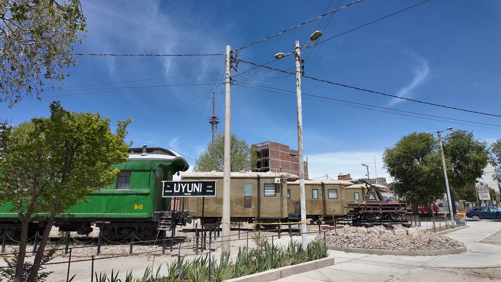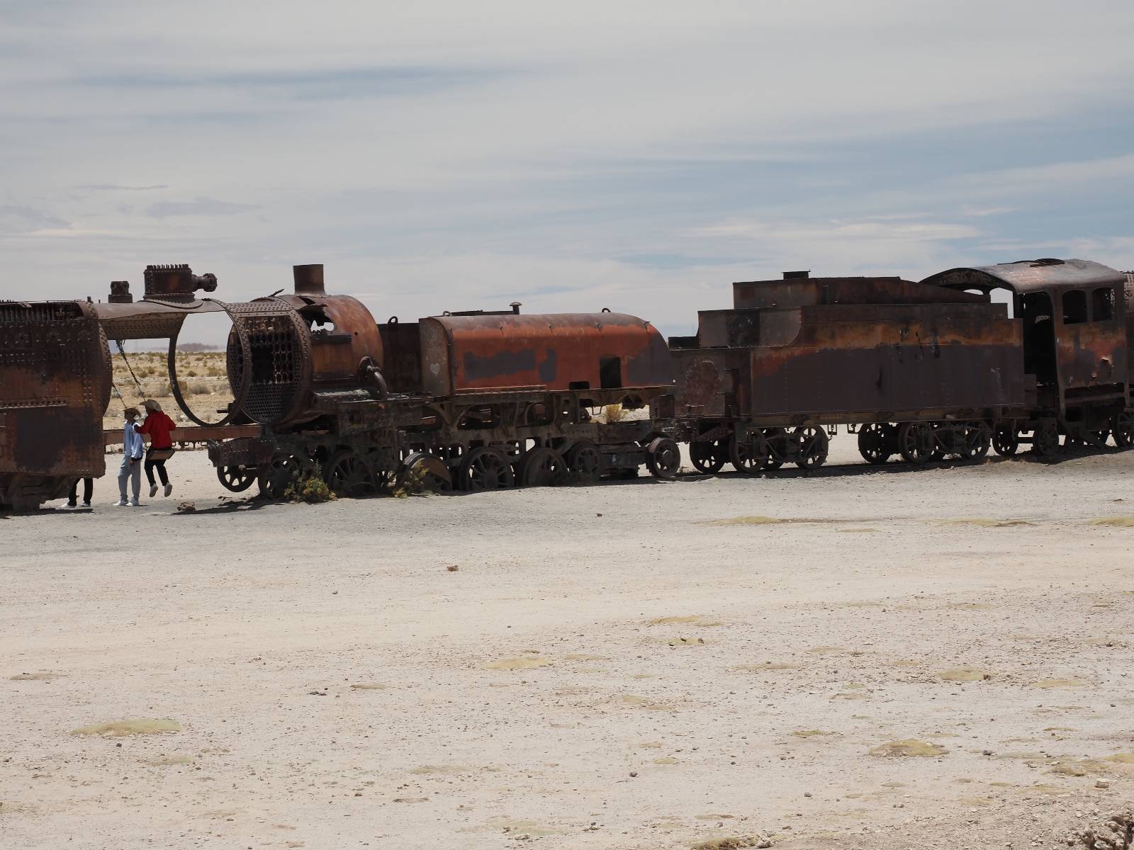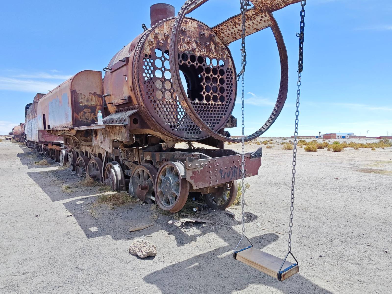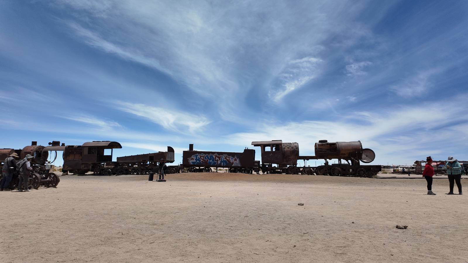 Der nächste Tag ist spannender! Ich will unbedingt zum Cementario de los Trenes, zum Eisenbahfriedhof. Gut, dass ich vorher auf Google Maps geschaut habe wo er ist, mein Garmin hat keine Ahnung davon, wie schon so einige Male davor! Also fahre ich, nach Gedächtnis, was ganz gut funktioniet, ist ja alles quadratisch angelegt und ich habe ja Navigation für Dispatch gelernt! 😅 Auch hier dachte ich, vielleicht etwas blauäugig, daß ich den Platz weitestgehend für mich habe aber weit gefehlt! Alles was es an Touris in Uyuni gibt ist vor Ort! Haben die sich alle abgestimmt!? Egal, es ist bezaubernd! ich ignoriere alle anderen und genieße die alten im Sand versunkenen Loks und Wagons. Auch hier ruft wieder der wilde Westen! Ich genieße es und nach einer Weile sind all die anderen verschwunden und ich bin tatsächlich fast alleine! Zeit für die Drohne! Ich will noch tanken und fahre eine der Tankstellen an. Es ist Sonntag aber die erste hat zu. Trotzdem stehen schon einige Autos, zwar verlassen aber wartend davor. Ich fahre die nächste gleich um die Ecke an und ignoriere die lange Schlange. Ich frage ganz undschuldig, ob es Benzin gibt und bin daraufhin der Nächste. Umgerechnet kostet der subventionierte Sprit für die eigenen Leute ca. 30 Eurocent, für uns Ausländer ca. 90 Eurocent. Da tanke ich gerne und finde es schade, daß mein Tank nur 30L fasst. Für den Abend habe ich einen Tipp von James bekommen, der vor ein paar Jahren schon einmal mit seiner Frau hier war. Die Pizzaria, geführt von Chris aus Bosten ist eine Oase! Die Pizza mit Lama-Fleisch ist hervorragend und es gibt gezapftes Bier! Pizza-Oase-Uyuni