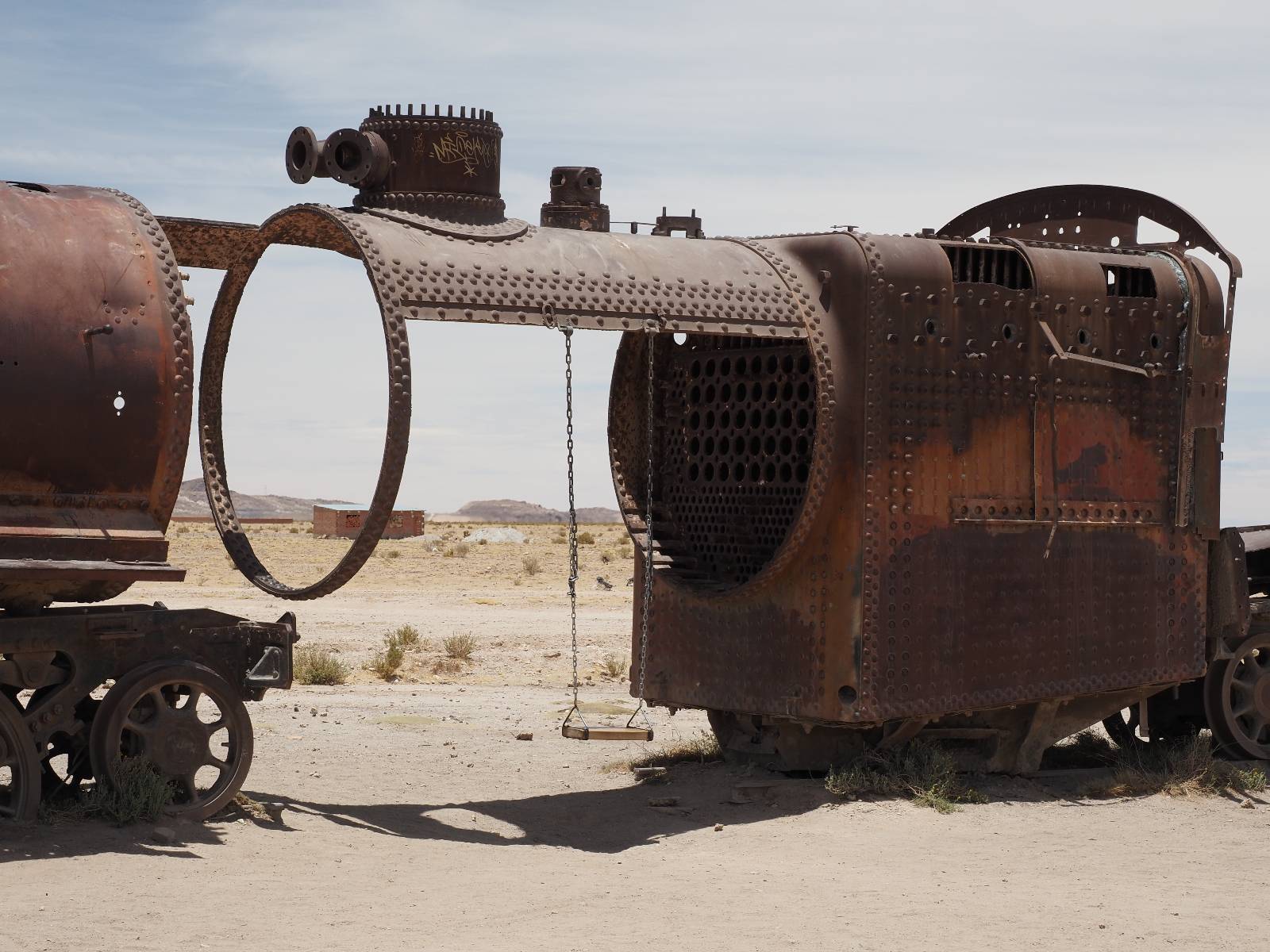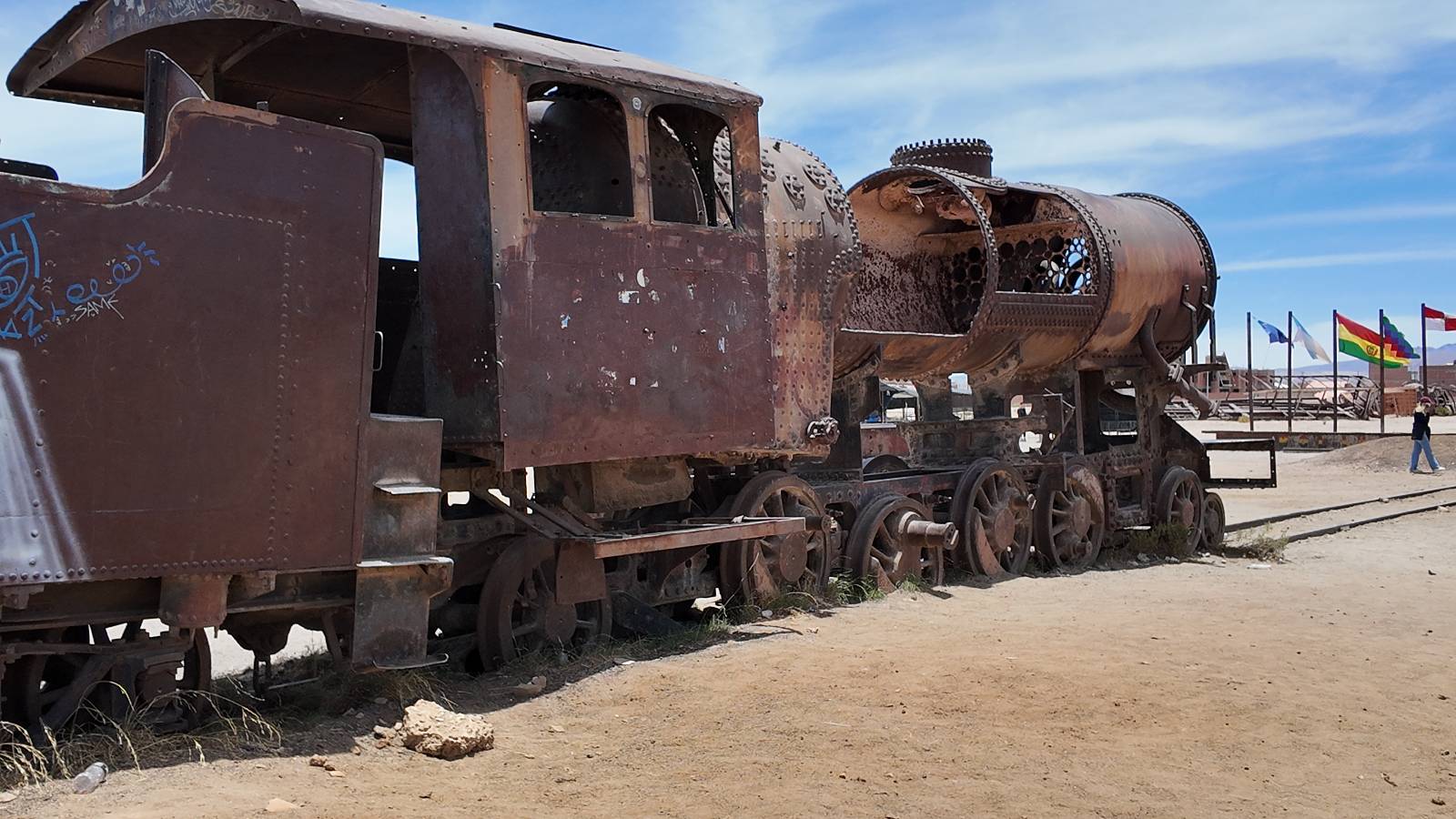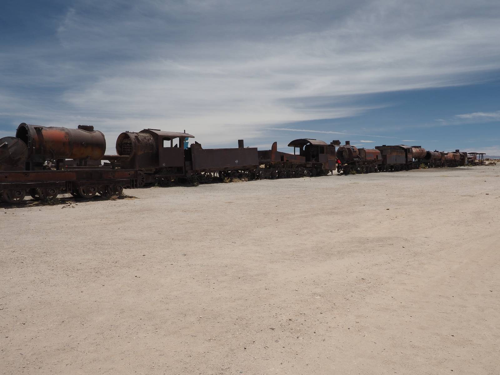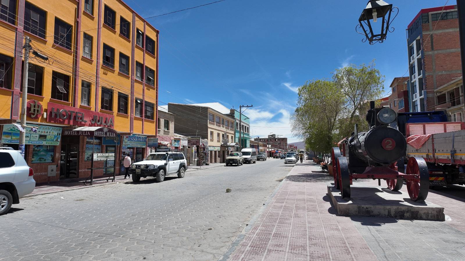 Der nächste Tag ist spannender! Ich will unbedingt zum Cementario de los Trenes, zum Eisenbahfriedhof. Gut, dass ich vorher auf Google Maps geschaut habe wo er ist, mein Garmin hat keine Ahnung davon, wie schon so einige Male davor! Also fahre ich, nach Gedächtnis, was ganz gut funktioniet, ist ja alles quadratisch angelegt und ich habe ja Navigation für Dispatch gelernt! 😅 Auch hier dachte ich, vielleicht etwas blauäugig, daß ich den Platz weitestgehend für mich habe aber weit gefehlt! Alles was es an Touris in Uyuni gibt ist vor Ort! Haben die sich alle abgestimmt!? Egal, es ist bezaubernd! ich ignoriere alle anderen und genieße die alten im Sand versunkenen Loks und Wagons. Auch hier ruft wieder der wilde Westen! Ich genieße es und nach einer Weile sind all die anderen verschwunden und ich bin tatsächlich fast alleine! Zeit für die Drohne! Ich will noch tanken und fahre eine der Tankstellen an. Es ist Sonntag aber die erste hat zu. Trotzdem stehen schon einige Autos, zwar verlassen aber wartend davor. Ich fahre die nächste gleich um die Ecke an und ignoriere die lange Schlange. Ich frage ganz undschuldig, ob es Benzin gibt und bin daraufhin der Nächste. Umgerechnet kostet der subventionierte Sprit für die eigenen Leute ca. 30 Eurocent, für uns Ausländer ca. 90 Eurocent. Da tanke ich gerne und finde es schade, daß mein Tank nur 30L fasst. Für den Abend habe ich einen Tipp von James bekommen, der vor ein paar Jahren schon einmal mit seiner Frau hier war. Die Pizzaria, geführt von Chris aus Bosten ist eine Oase! Die Pizza mit Lama-Fleisch ist hervorragend und es gibt gezapftes Bier! Pizza-Oase-Uyuni