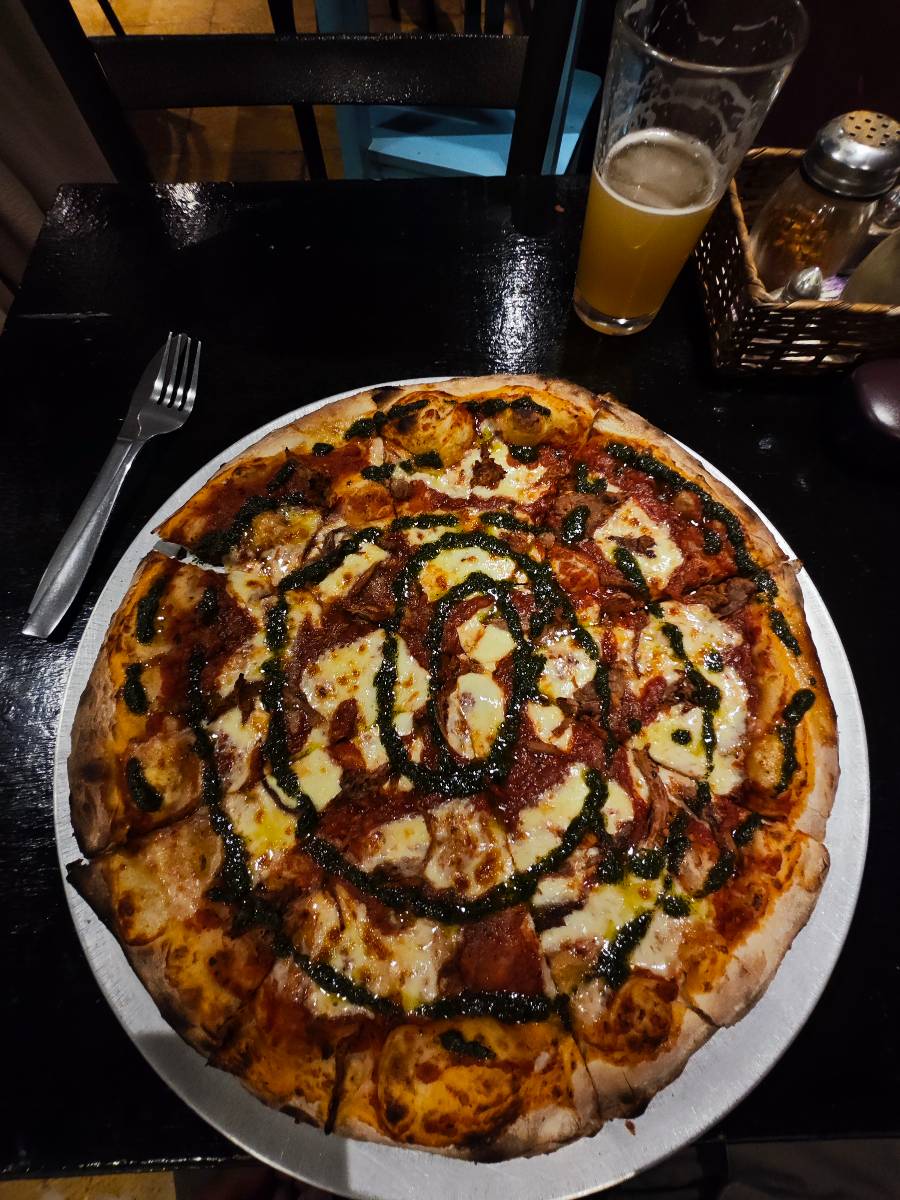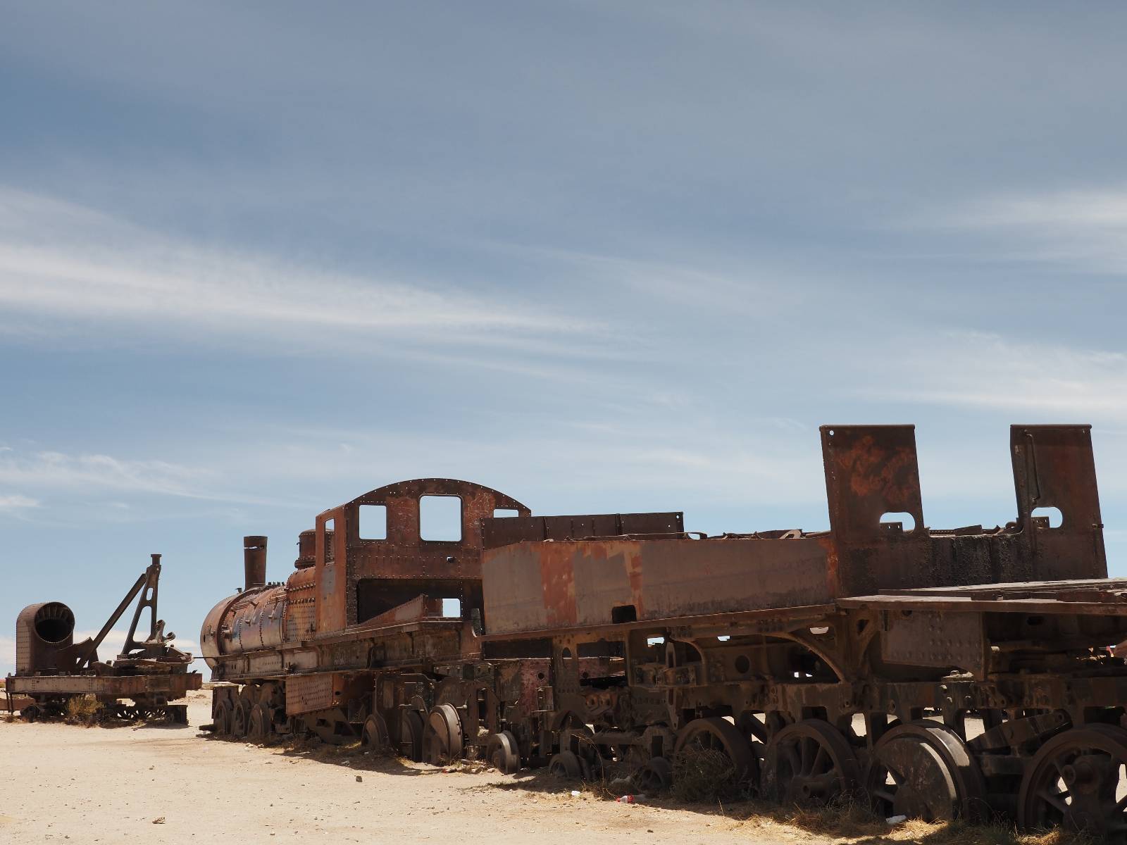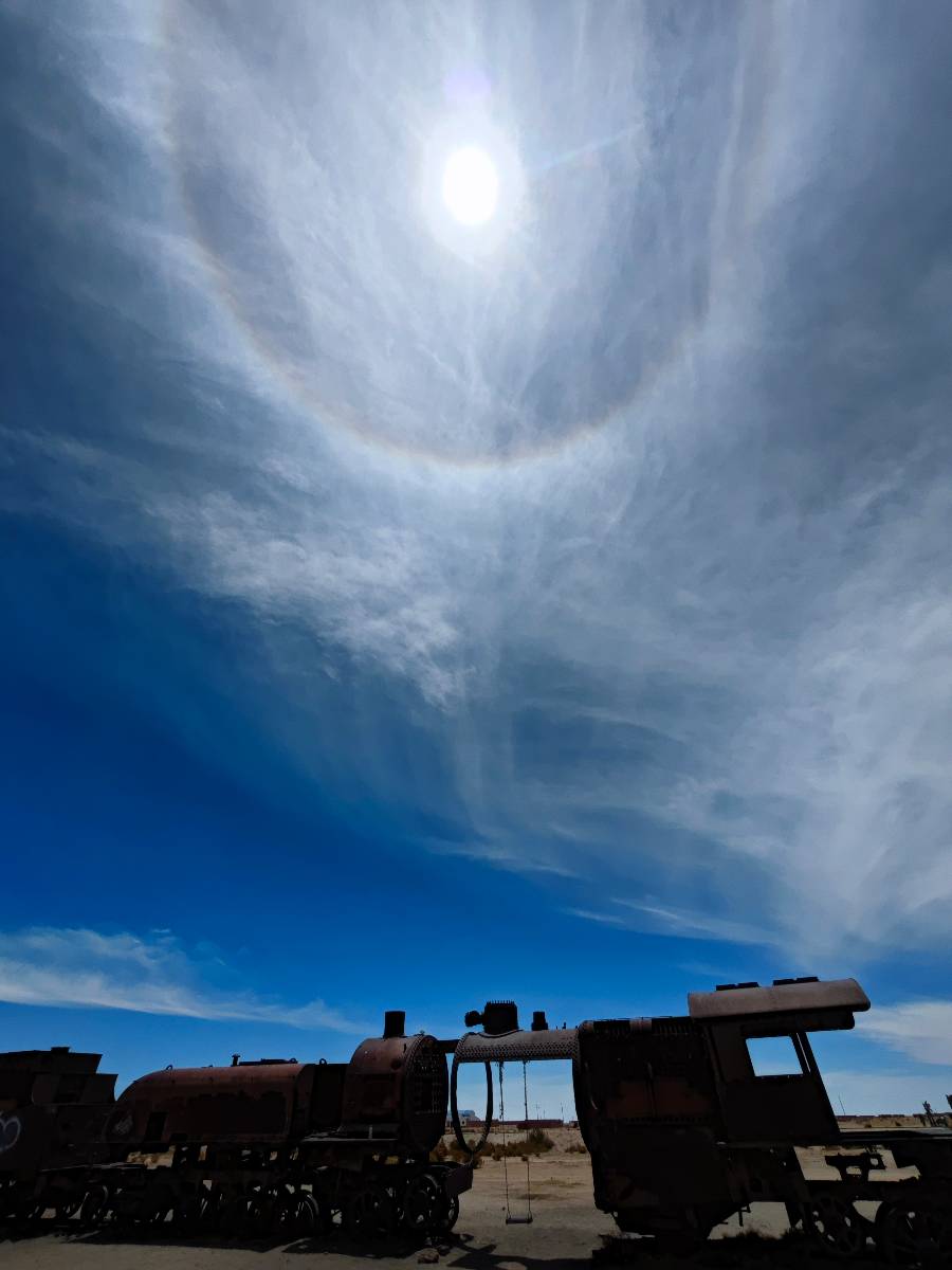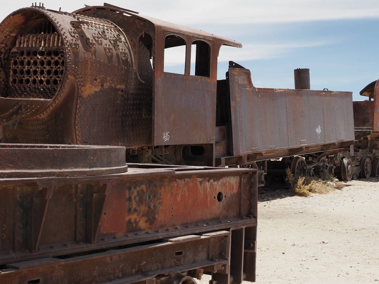 Der nächste Tag ist spannender! Ich will unbedingt zum Cementario de los Trenes, zum Eisenbahfriedhof. Gut, dass ich vorher auf Google Maps geschaut habe wo er ist, mein Garmin hat keine Ahnung davon, wie schon so einige Male davor! Also fahre ich, nach Gedächtnis, was ganz gut funktioniet, ist ja alles quadratisch angelegt und ich habe ja Navigation für Dispatch gelernt! 😅 Auch hier dachte ich, vielleicht etwas blauäugig, daß ich den Platz weitestgehend für mich habe aber weit gefehlt! Alles was es an Touris in Uyuni gibt ist vor Ort! Haben die sich alle abgestimmt!? Egal, es ist bezaubernd! ich ignoriere alle anderen und genieße die alten im Sand versunkenen Loks und Wagons. Auch hier ruft wieder der wilde Westen! Ich genieße es und nach einer Weile sind all die anderen verschwunden und ich bin tatsächlich fast alleine! Zeit für die Drohne! Ich will noch tanken und fahre eine der Tankstellen an. Es ist Sonntag aber die erste hat zu. Trotzdem stehen schon einige Autos, zwar verlassen aber wartend davor. Ich fahre die nächste gleich um die Ecke an und ignoriere die lange Schlange. Ich frage ganz undschuldig, ob es Benzin gibt und bin daraufhin der Nächste. Umgerechnet kostet der subventionierte Sprit für die eigenen Leute ca. 30 Eurocent, für uns Ausländer ca. 90 Eurocent. Da tanke ich gerne und finde es schade, daß mein Tank nur 30L fasst. Für den Abend habe ich einen Tipp von James bekommen, der vor ein paar Jahren schon einmal mit seiner Frau hier war. Die Pizzaria, geführt von Chris aus Bosten ist eine Oase! Die Pizza mit Lama-Fleisch ist hervorragend und es gibt gezapftes Bier! Pizza-Oase-Uyuni