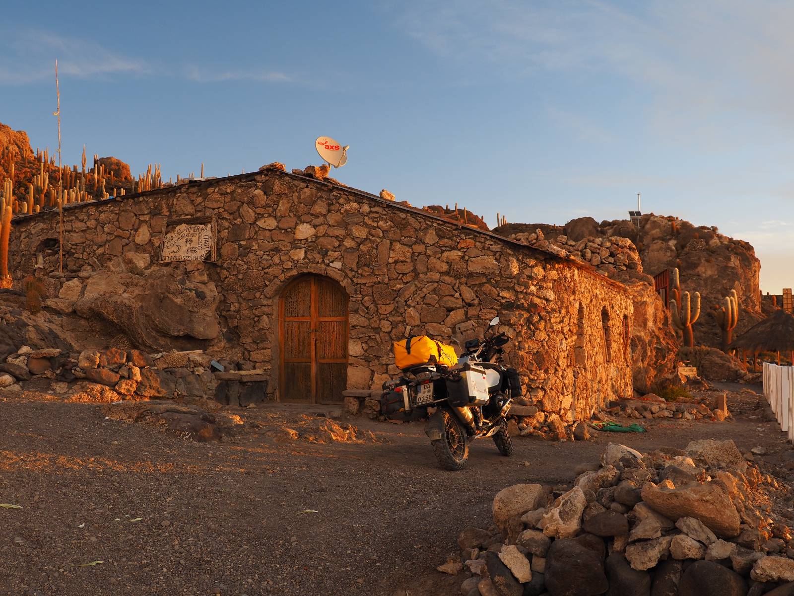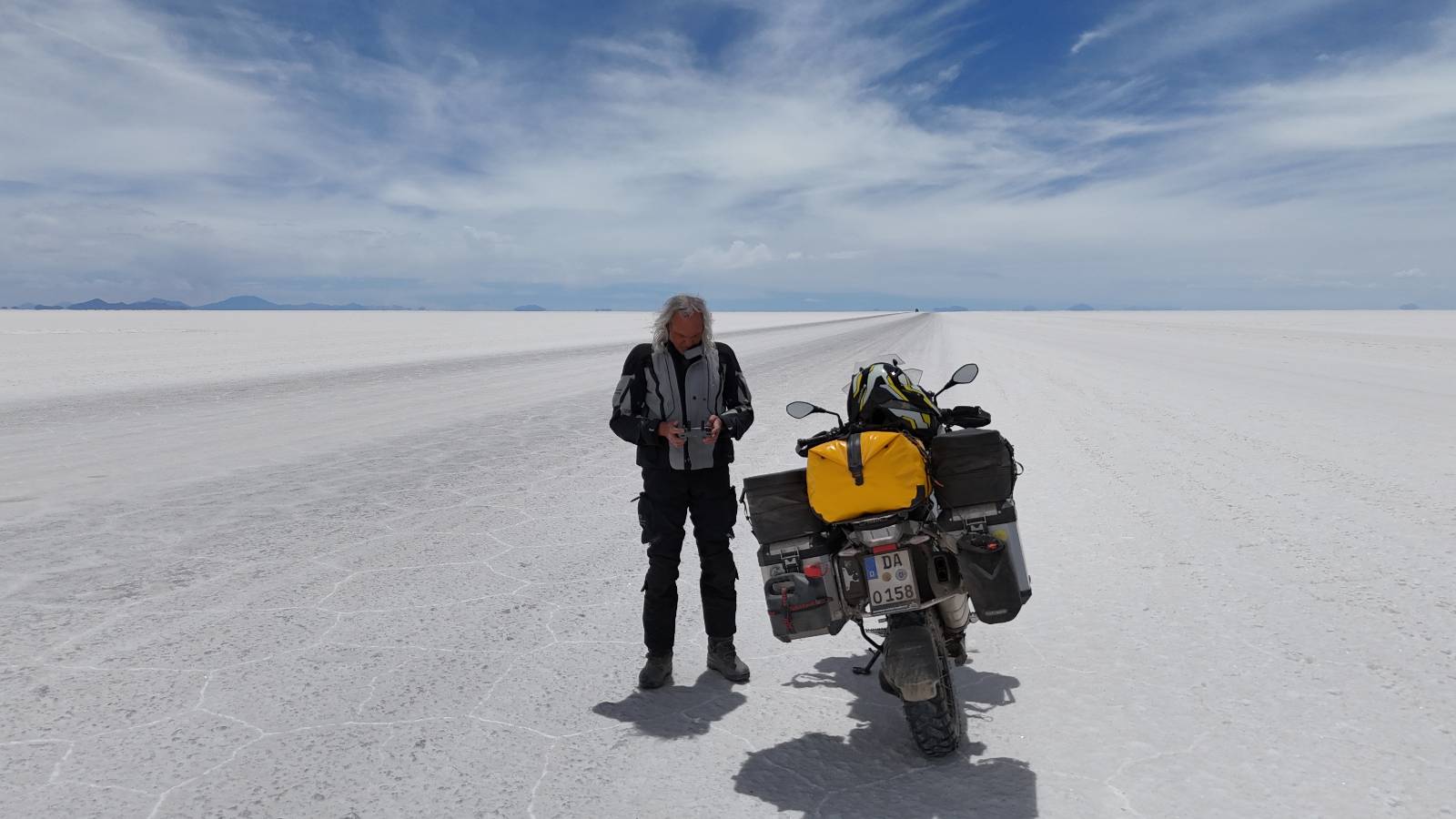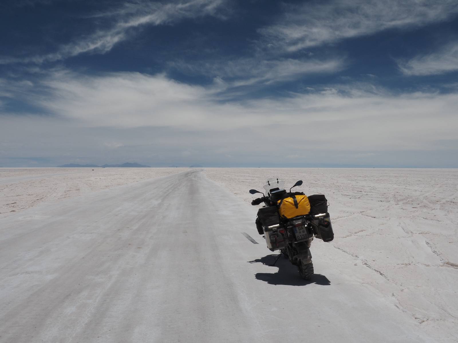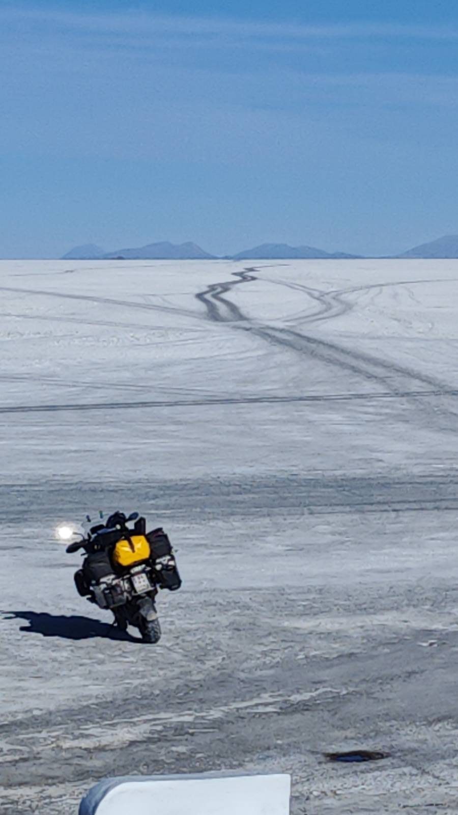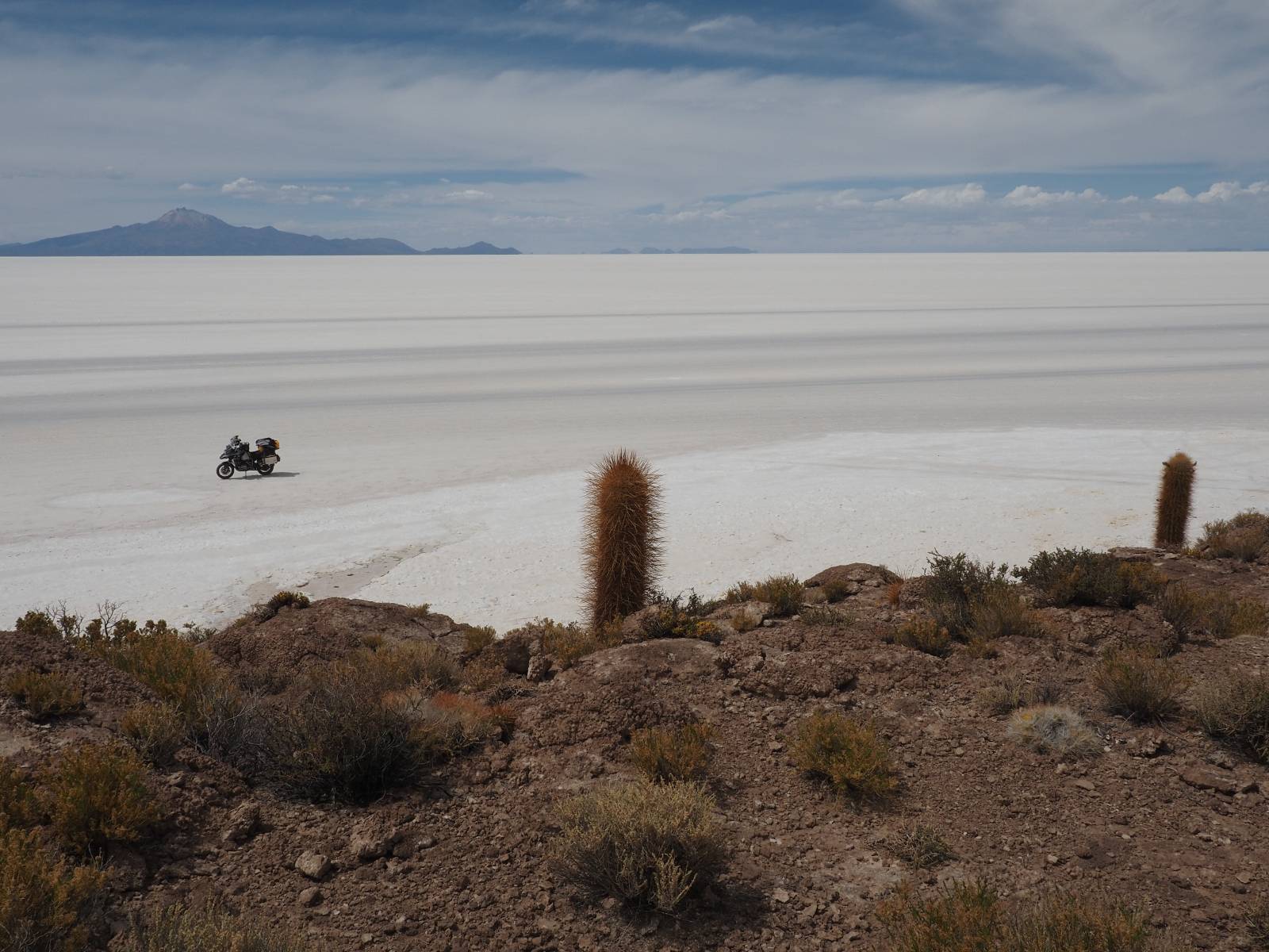 Ich packe wie gewöhnlich und fahre zum Salar de Uyuni. Der Einstieg befindet sich etwas nördlich im Örtchen Colchani. Dort fürt eine Piste auf den Salzsee, wo sich nach etwas Wirrwar die Pisten in verschieden Richtungen verteilen. Natürlich weiß mein Navi nicht wo ich hin will. Zumindest kennt es die Isla Incahuasi nicht! Erst als ich mit etwas hin und her zoomen die Isla im Display finde und diese als Koordinate angebe, habe ich das Gefühl, das mein Garmin dem dunklen Streifen, auf dem ich fahre folgt. Unglaublich! Es ist einfach unglaublich, einfach nur ganz viel Weiß um mich herum. Ok, es ist Anfang November und zu Hause sind die Blätter runter aber hier ballert die Sonne und es ist kein Schnee! Meine ersten beiden Stationen sind das Monumento al Dakar, das für die Dakar Rally steht, die zwischen 2014 und 2018 durch Bolivien führte. Da muss natürlich jeder Motorradfgahrer in Südamerika einmal gesewen sein! 😉 Und zum Plazas de las Banderas, der nur wenige Meter vom Dakar-Monument steht. Da das Dakar-Monument aus Salz besteht, war auch gerade ein Einer dabei, das Weiß um die Buchstaben neu zu beschichten. Einfach das Salz vom „See“ mit etwas Wasser mischen und als frischer neuer Putz drauf geklatscht! Ich blieb nicht dort in dem Salzhotel, sondern folgte nun dem lila Strich in meinem Navi, der nun einigermaßen zu dem „Schwarzen“ auf dem Salzsee passte zur Isla Incahuasi. Von nun an ca 80km einfach nur durchs Weiß! Irre absolut irre! Durch die Berge weit rings herum sieht man irgendwie einen Horizont, der aber nur bedingt näher kommt. Du fährst und hast das Gefühl leicht Berg auf zu fahren und dort hinten am Horizont geht es wieder runter. Und du denkst, ok bis dahin fahre ich und mache eine kleine Pause….aber nein, es ist immer so! Ich bleibe eigentlich immer auf 3665m Höhe und es ändert sich nichts, gar nichts. Ab und zu werde ich von Touri 4x4s überholt oder sie kommen mir entgegen! Und auch das ist ein kleines Schauspiel. Erst ein kleiner schwarzer Punkt am Horizont und dann schwupps an mir vorbei und wieder nur ein kleiner scharzer Punkt! Ich bin hin und weg! Am Anfang fahre ich noch vorsichtig. Es sieht aus wie eine fest gefahrene Schneedecke, die sich eisig spiegelt aber es ist wirklich griffig und bald gurke ich mit gemütlichen 80-90 über den Salar und genieße es einfach nur! Nach einer guten Stunde taucht die Isla Incahuasi auf. Ich fahre den ersten Zipfel an und staune über die riesigen Kakteen. Mal vorsichtig so einen Stachel zu berühren wird gleich mit einem Piekser quitiert! Gleich um die Ecke ist das Touristenzentrum. Ich hocke mich mit an den Kiosk, wo ich mit zwei Österreicherinnen und einem Itaiener ins Gespräch komme. Giovanni ist mit dem Fahrrad unterwegs, so wie einige andere, was ich wirklich bemerkenswert finde!! Alle Achtung! So wie ich will auch er die Nacht hier verbringen. Er weist mich darauf hin, dass er gegen 18:30 Uhr Abendbrot bestellt hat und meint ich solle doch auch mal fragen. Tue ich. Unser Abendbrot besteht aus Reis, mit einem Spiegelei und etwas klein geschnittenen Gurken und Tomaten. Giovanni hatte es schon einige Male probiert aber als die meisten Touristenautos weg sind und er einen neuen Versuch startet, bekommen wir eine kleine Kammer zum übernachten. Auf zwei Steinbänken mit Decken breiten wir unsere Schlafsäcke aus. Angeblich hatte er im Nebenzimmer „Mickey Mouse“ gesehen… Wir genießen bei einem Bier die Abendstimmung, die den Salar mit etwas Wolken in diversen pastell Farben für uns bereit hält. Eigentlich hatte ich ja das Zelt nehmen wollen, aber so wie der Wind bläst, war das vielleicht ganz gut so. Die Nacht ist soweit eigentlich in Ordnung. Ich hatte es mir schlimmer vorgestellt, von wegen diverser Geräusche. Gut ich habe meine Ohrstöpsel, damit beuge ich den meisten Lärmbelästigungen ganz gut vor. Am nächsten Morgen gibt es Frühstück um 08:30 Uhr. Ich muss Giovanni noch kurz aufklären, dass wir noch eine Stunde Zeit haben, da er von der Stunde mehr Zeitunterschied noch nicht wusste. Das Frühstück besteht aus ein paar Keksen, drei Scheiben Toast und für jeden ein Spiegelei! Giovanni hat Coca-Mate-Blätter zum Tee machen. Das soll gegen die Höhe helfen, so wie ich die Coca-Bonbon benutze. Nein, die machen nix! Ich habs ja nun ausprobiert, beides! Aber so ein bisschen gegen die Höhe helfen sie schon, nur wirklich merken tut man nichts. Mir geht es damit etwas normaler. „Oben“ muss ich schon etwas schnaufen, die Nase lässt gern auch etwas Blut raus und im Bauch ist es etwas nervöser. Das bessert sich dann. Aurelia 68 die uns das Frühstück serviert hat ist etwas verstimmt. Sie spricht immer davon, dass sie kein Brot und keine Butter hat. Wahrscheinlich kostet das Frühstück deswegen nicht sehr viel. Eigentlich nur einen Obulus. Ich spendiere Giovanni noch eine Banane bevor er sich aufs Fahrrad schwingt, dann radelt er davon. Ich nehme die andere Richtung zur Isla del Pescado. Ich genieße die Fahrt und biege auf Höhe der Isla zum rechten Ufer ab. James hatte mir ein kleines Museum empfolen mit ein paar Mumien vom alten Volk der Chullpas. Sie lebten dort noch vor den Incas also vor mehr al 1000 Jahjren. Das Museun ist klein, etwas eingestaubt aber ganz nett. Ich bekomme ein wenig zu den Ausstellungstücken erzählt und in einem kleine Kunst-Garten darf ich noch in eine nachgestellte Höle mit zwei echten Skeletten schauen. Was die sich bei meinem Anblick denken? Das Hotel gegenüber mutet sehr luxuriös an aber leider auch der Preis. Für nur einen Kurzaufenthalt hätte ich mir ein Zimmer mit Salzfußboden und Blick auf den Salar gegönnt. Der Tag ist noch nicht alt und so beschließe ich mich doch Richtung Grenze zu bewegen. Noch einmal über den Salar. Mittendrin, wo wieder nur die entfernten Berge den riesigen weißen Fleck auf der Karte umringhen mache ich einen Meditationsstop. Naja, ich hocke mich einfach nur daher, snacke ein wenig und genieße einfach nur das