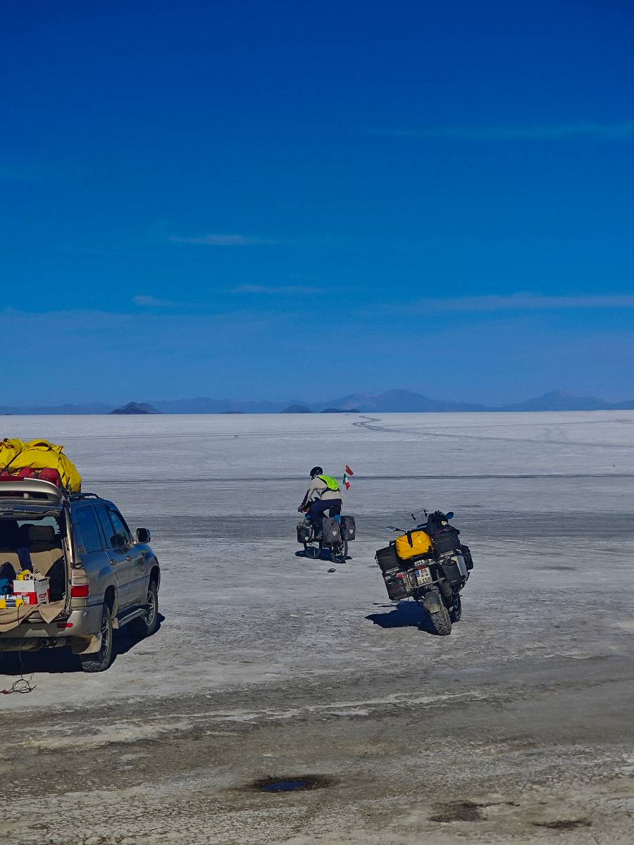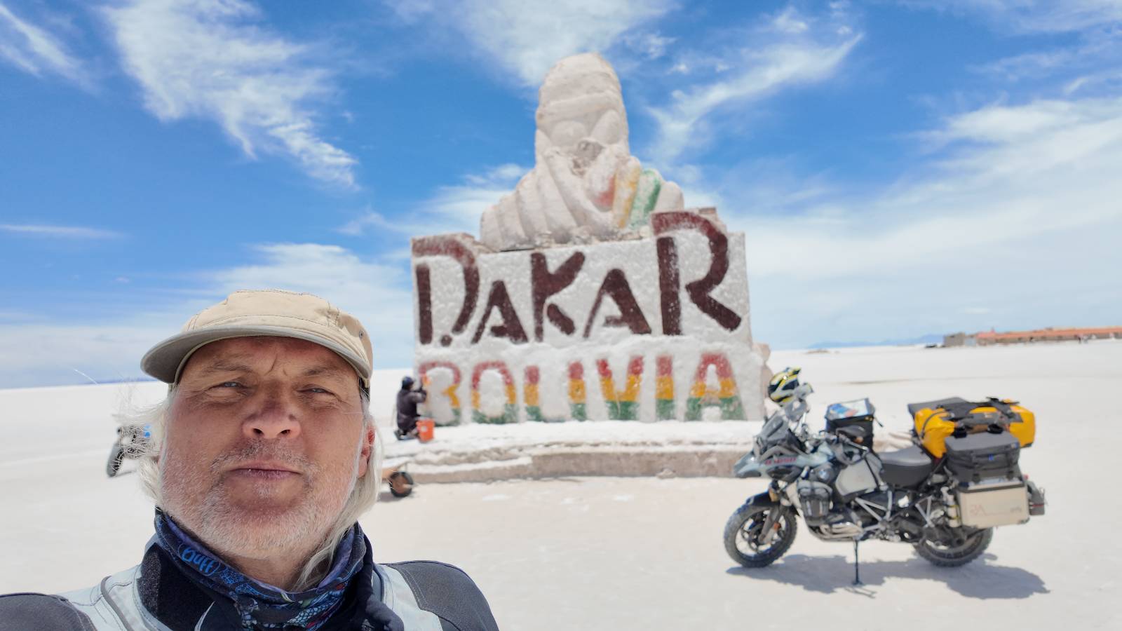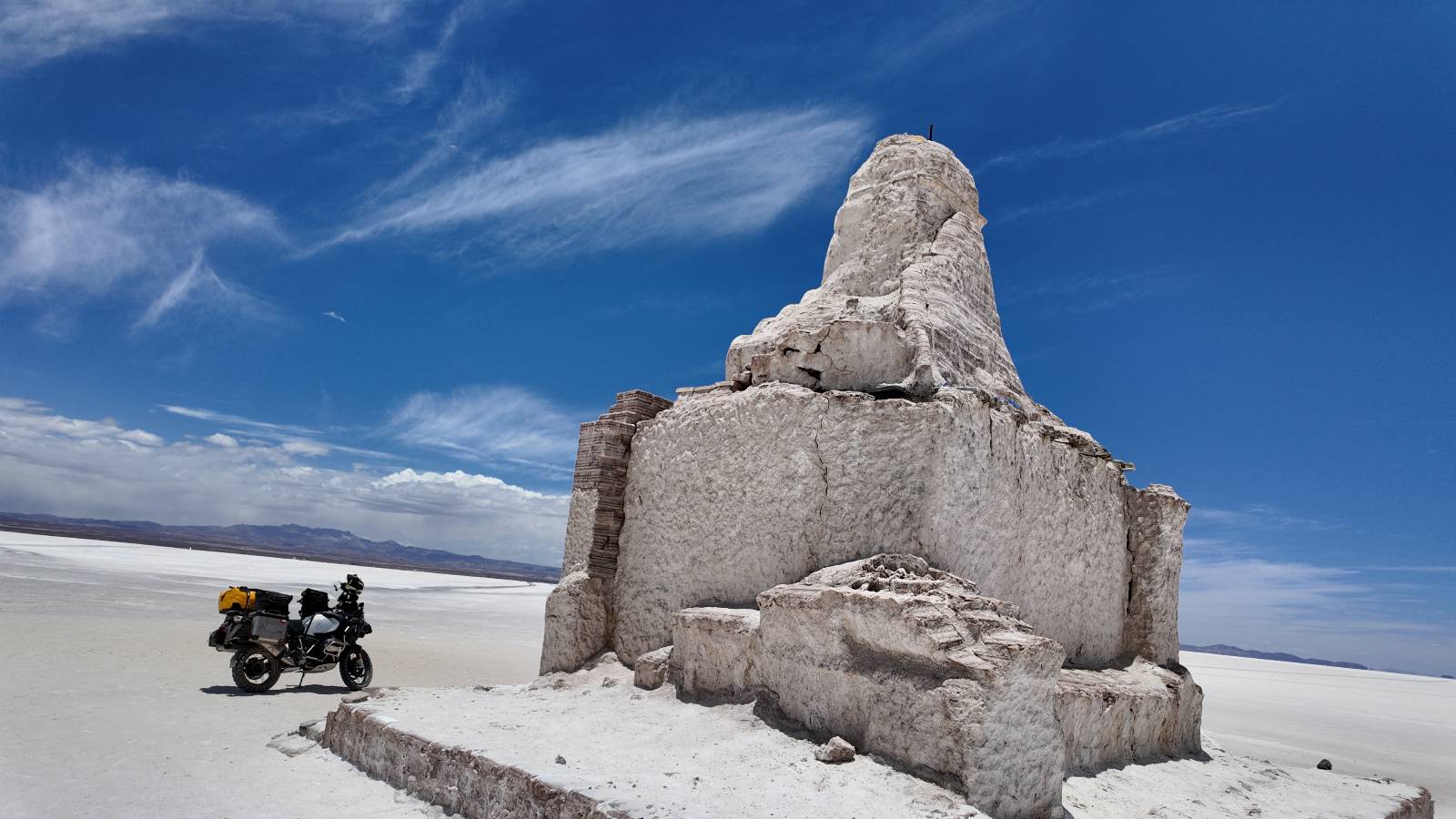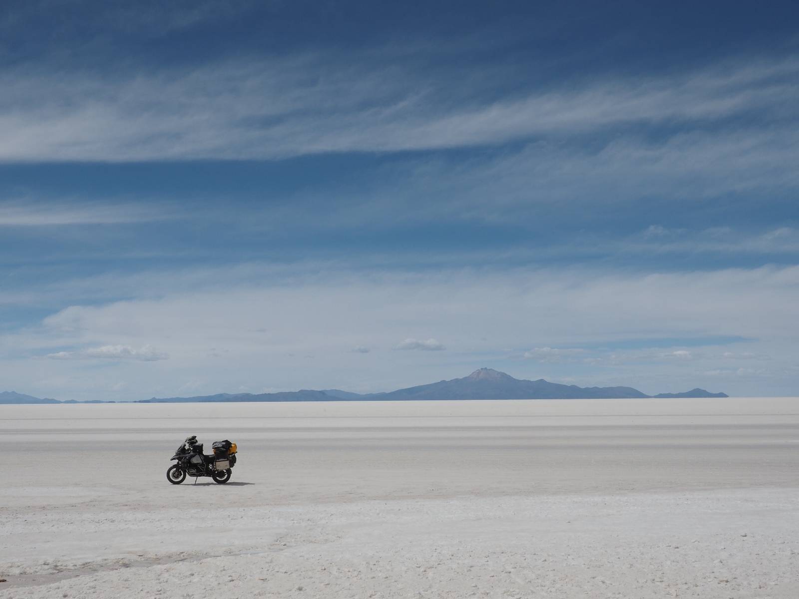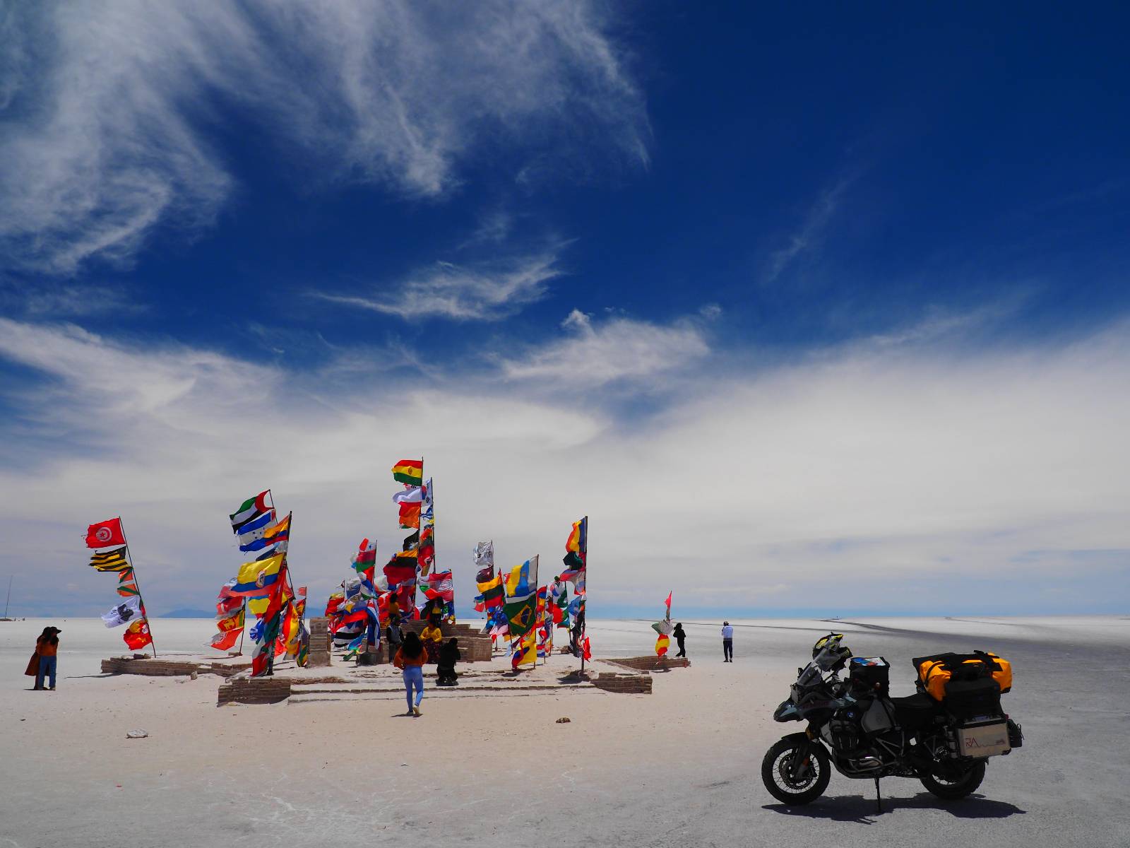 Ich packe wie gewöhnlich und fahre zum Salar de Uyuni. Der Einstieg befindet sich etwas nördlich im Örtchen Colchani. Dort fürt eine Piste auf den Salzsee, wo sich nach etwas Wirrwar die Pisten in verschieden Richtungen verteilen. Natürlich weiß mein Navi nicht wo ich hin will. Zumindest kennt es die Isla Incahuasi nicht! Erst als ich mit etwas hin und her zoomen die Isla im Display finde und diese als Koordinate angebe, habe ich das Gefühl, das mein Garmin dem dunklen Streifen, auf dem ich fahre folgt. Unglaublich! Es ist einfach unglaublich, einfach nur ganz viel Weiß um mich herum. Ok, es ist Anfang November und zu Hause sind die Blätter runter aber hier ballert die Sonne und es ist kein Schnee! Meine ersten beiden Stationen sind das Monumento al Dakar, das für die Dakar Rally steht, die zwischen 2014 und 2018 durch Bolivien führte. Da muss natürlich jeder Motorradfgahrer in Südamerika einmal gesewen sein! 😉 Und zum Plazas de las Banderas, der nur wenige Meter vom Dakar-Monument steht. Da das Dakar-Monument aus Salz besteht, war auch gerade ein Einer dabei, das Weiß um die Buchstaben neu zu beschichten. Einfach das Salz vom „See“ mit etwas Wasser mischen und als frischer neuer Putz drauf geklatscht! Ich blieb nicht dort in dem Salzhotel, sondern folgte nun dem lila Strich in meinem Navi, der nun einigermaßen zu dem „Schwarzen“ auf dem Salzsee passte zur Isla Incahuasi. Von nun an ca 80km einfach nur durchs Weiß! Irre absolut irre! Durch die Berge weit rings herum sieht man irgendwie einen Horizont, der aber nur bedingt näher kommt. Du fährst und hast das Gefühl leicht Berg auf zu fahren und dort hinten am Horizont geht es wieder runter. Und du denkst, ok bis dahin fahre ich und mache eine kleine Pause….aber nein, es ist immer so! Ich bleibe eigentlich immer auf 3665m Höhe und es ändert sich nichts, gar nichts. Ab und zu werde ich von Touri 4x4s überholt oder sie kommen mir entgegen! Und auch das ist ein kleines Schauspiel. Erst ein kleiner schwarzer Punkt am Horizont und dann schwupps an mir vorbei und wieder nur ein kleiner scharzer Punkt! Ich bin hin und weg! Am Anfang fahre ich noch vorsichtig. Es sieht aus wie eine fest gefahrene Schneedecke, die sich eisig spiegelt aber es ist wirklich griffig und bald gurke ich mit gemütlichen 80-90 über den Salar und genieße es einfach nur! Nach einer guten Stunde taucht die Isla Incahuasi auf. Ich fahre den ersten Zipfel an und staune über die riesigen Kakteen. Mal vorsichtig so einen Stachel zu berühren wird gleich mit einem Piekser quitiert! Gleich um die Ecke ist das Touristenzentrum. Ich hocke mich mit an den Kiosk, wo ich mit zwei Österreicherinnen und einem Itaiener ins Gespräch komme. Giovanni ist mit dem Fahrrad unterwegs, so wie einige andere, was ich wirklich bemerkenswert finde!! Alle Achtung! So wie ich will auch er die Nacht hier verbringen. Er weist mich darauf hin, dass er gegen 18:30 Uhr Abendbrot bestellt hat und meint ich solle doch auch mal fragen. Tue ich. Unser Abendbrot besteht aus Reis, mit einem Spiegelei und etwas klein geschnittenen Gurken und Tomaten. Giovanni hatte es schon einige Male probiert aber als die meisten Touristenautos weg sind und er einen neuen Versuch startet, bekommen wir eine kleine Kammer zum übernachten. Auf zwei Steinbänken mit Decken breiten wir unsere Schlafsäcke aus. Angeblich hatte er im Nebenzimmer „Mickey Mouse“ gesehen… Wir genießen bei einem Bier die Abendstimmung, die den Salar mit etwas Wolken in diversen pastell Farben für uns bereit hält. Eigentlich hatte ich ja das Zelt nehmen wollen, aber so wie der Wind bläst, war das vielleicht ganz gut so. Die Nacht ist soweit eigentlich in Ordnung. Ich hatte es mir schlimmer vorgestellt, von wegen diverser Geräusche. Gut ich habe meine Ohrstöpsel, damit beuge ich den meisten Lärmbelästigungen ganz gut vor. Am nächsten Morgen gibt es Frühstück um 08:30 Uhr. Ich muss Giovanni noch kurz aufklären, dass wir noch eine Stunde Zeit haben, da er von der Stunde mehr Zeitunterschied noch nicht wusste. Das Frühstück besteht aus ein paar Keksen, drei Scheiben Toast und für jeden ein Spiegelei! Giovanni hat Coca-Mate-Blätter zum Tee machen. Das soll gegen die Höhe helfen, so wie ich die Coca-Bonbon benutze. Nein, die machen nix! Ich habs ja nun ausprobiert, beides! Aber so ein bisschen gegen die Höhe helfen sie schon, nur wirklich merken tut man nichts. Mir geht es damit etwas normaler. „Oben“ muss ich schon etwas schnaufen, die Nase lässt gern auch etwas Blut raus und im Bauch ist es etwas nervöser. Das bessert sich dann. Aurelia 68 die uns das Frühstück serviert hat ist etwas verstimmt. Sie spricht immer davon, dass sie kein Brot und keine Butter hat. Wahrscheinlich kostet das Frühstück deswegen nicht sehr viel. Eigentlich nur einen Obulus. Ich spendiere Giovanni noch eine Banane bevor er sich aufs Fahrrad schwingt, dann radelt er davon. Ich nehme die andere Richtung zur Isla del Pescado. Ich genieße die Fahrt und biege auf Höhe der Isla zum rechten Ufer ab. James hatte mir ein kleines Museum empfolen mit ein paar Mumien vom alten Volk der Chullpas. Sie lebten dort noch vor den Incas also vor mehr al 1000 Jahjren. Das Museun ist klein, etwas eingestaubt aber ganz nett. Ich bekomme ein wenig zu den Ausstellungstücken erzählt und in einem kleine Kunst-Garten darf ich noch in eine nachgestellte Höle mit zwei echten Skeletten schauen. Was die sich bei meinem Anblick denken? Das Hotel gegenüber mutet sehr luxuriös an aber leider auch der Preis. Für nur einen Kurzaufenthalt hätte ich mir ein Zimmer mit Salzfußboden und Blick auf den Salar gegönnt. Der Tag ist noch nicht alt und so beschließe ich mich doch Richtung Grenze zu bewegen. Noch einmal über den Salar. Mittendrin, wo wieder nur die entfernten Berge den riesigen weißen Fleck auf der Karte umringhen mache ich einen Meditationsstop. Naja, ich hocke mich einfach nur daher, snacke ein wenig und genieße einfach nur das