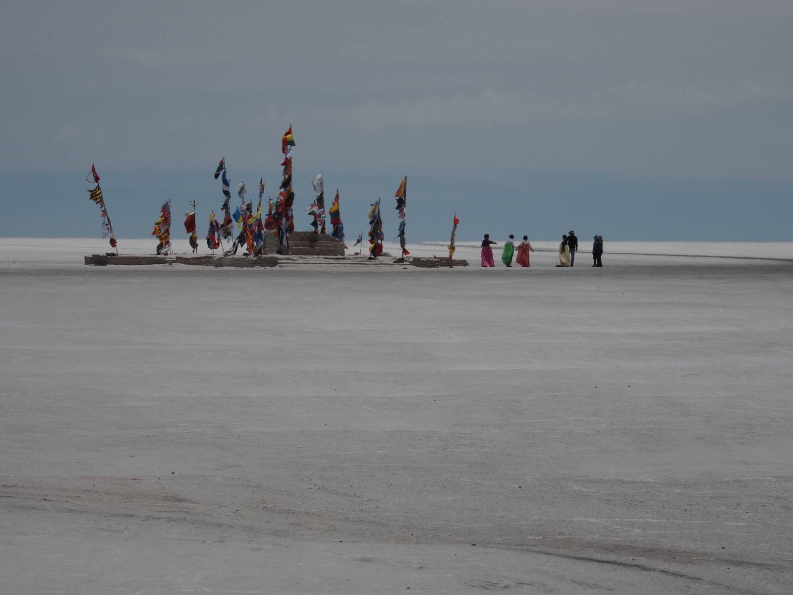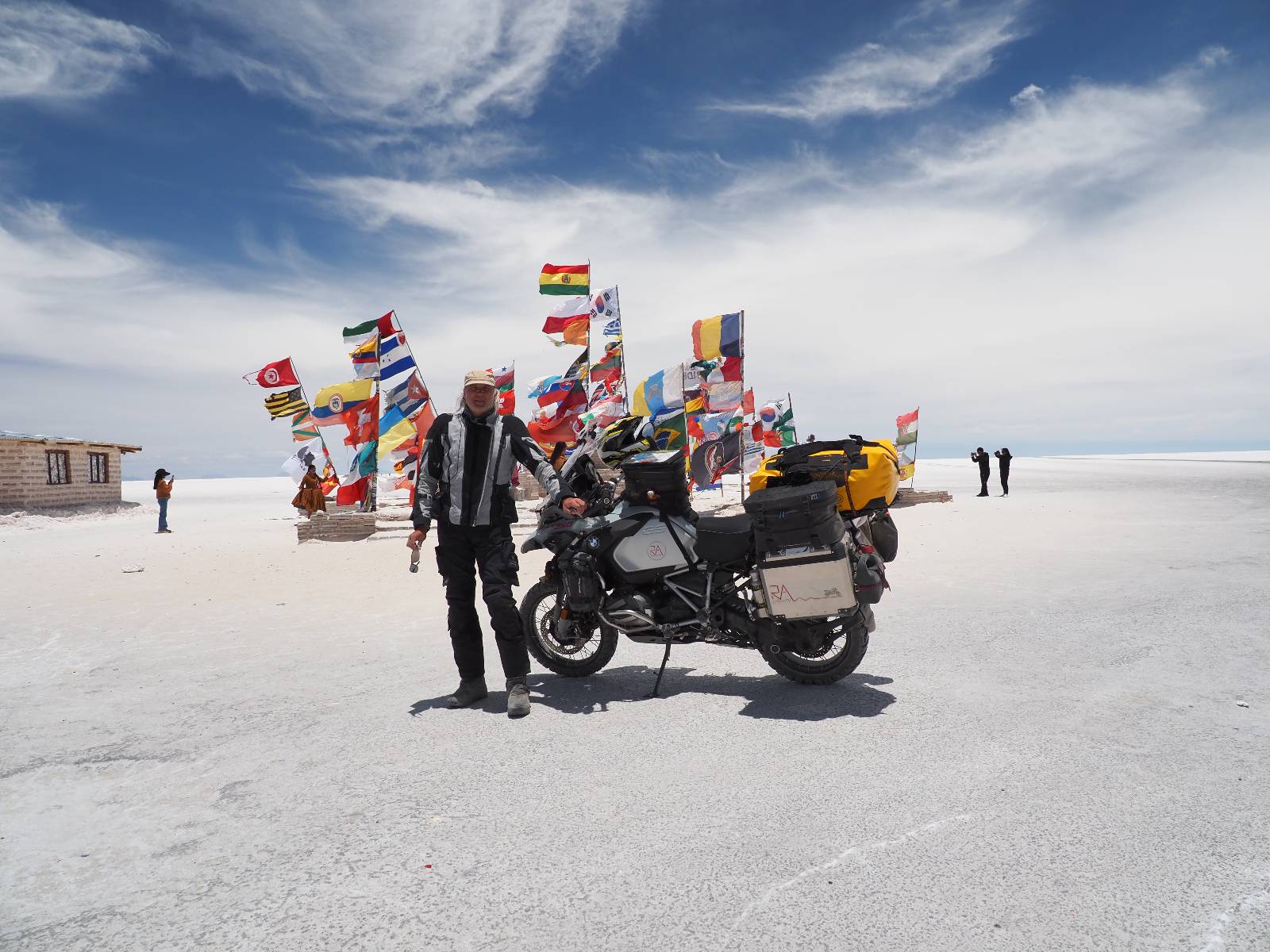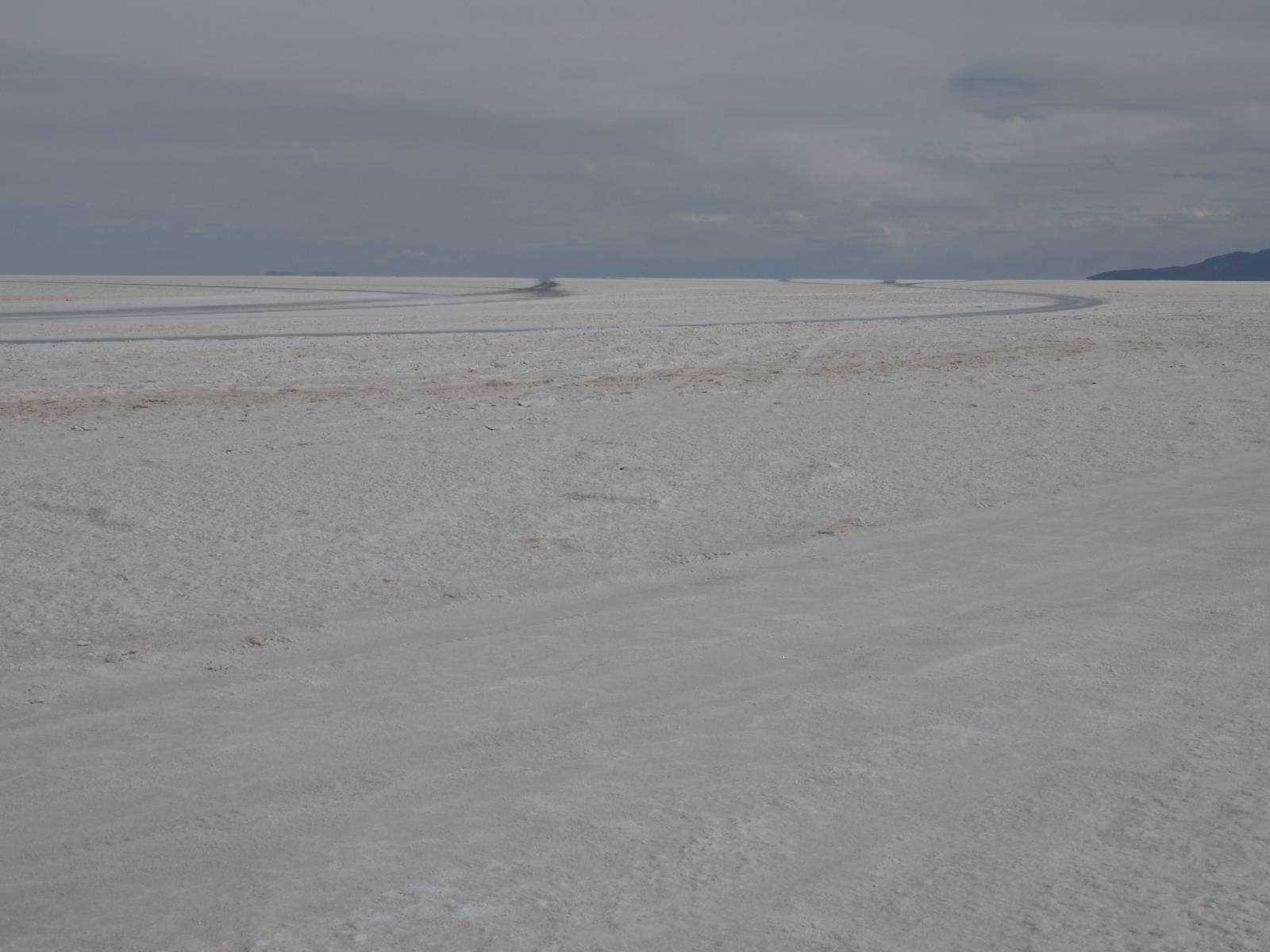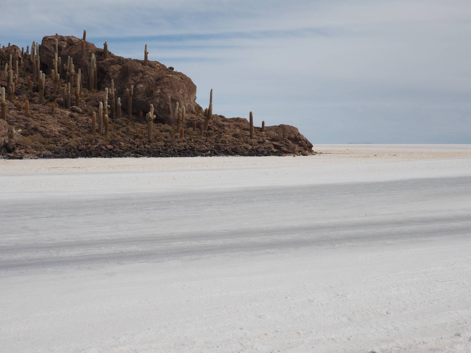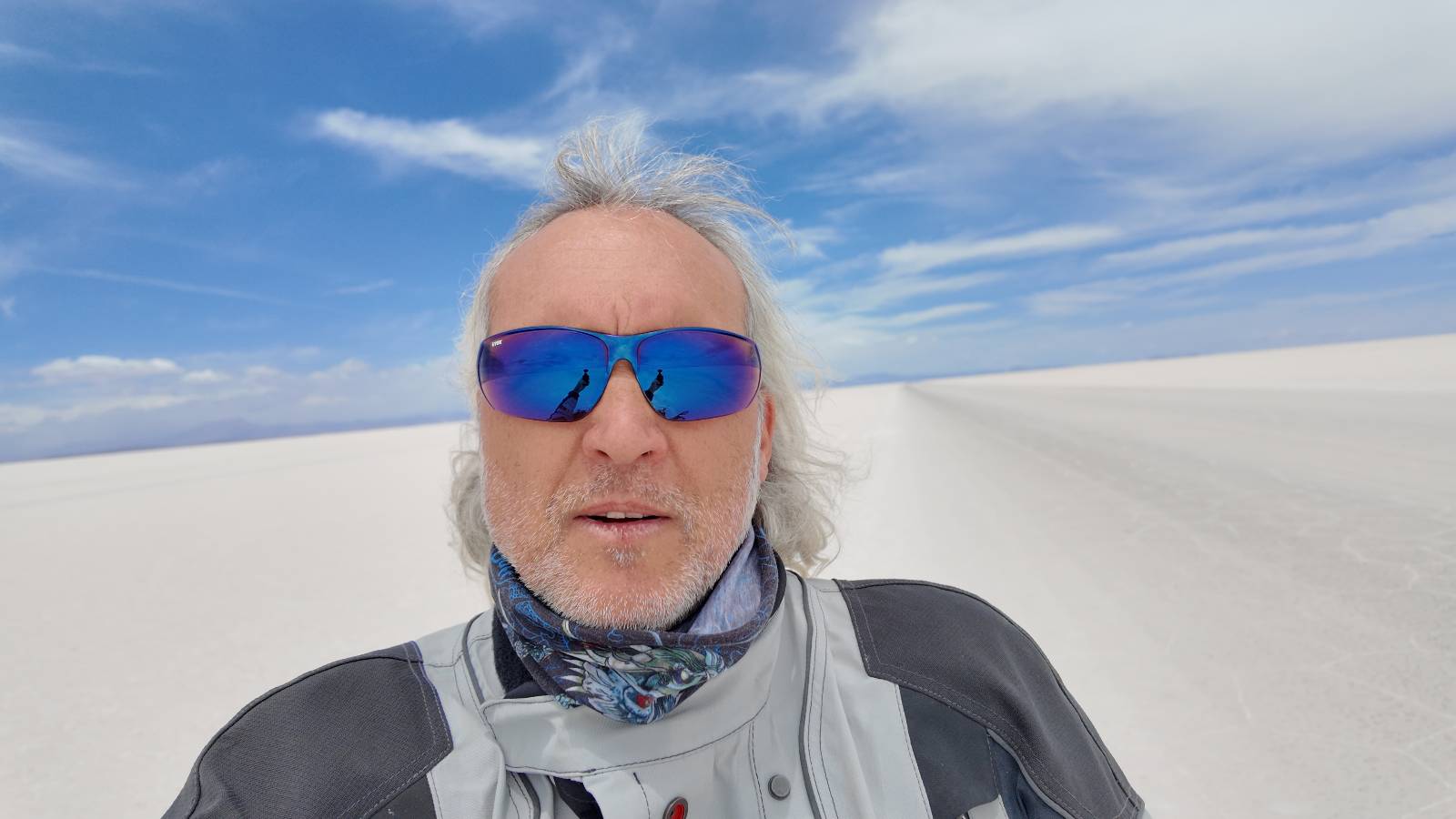 Ich packe wie gewöhnlich und fahre zum Salar de Uyuni. Der Einstieg befindet sich etwas nördlich im Örtchen Colchani. Dort fürt eine Piste auf den Salzsee, wo sich nach etwas Wirrwar die Pisten in verschieden Richtungen verteilen. Natürlich weiß mein Navi nicht wo ich hin will. Zumindest kennt es die Isla Incahuasi nicht! Erst als ich mit etwas hin und her zoomen die Isla im Display finde und diese als Koordinate angebe, habe ich das Gefühl, das mein Garmin dem dunklen Streifen, auf dem ich fahre folgt. Unglaublich! Es ist einfach unglaublich, einfach nur ganz viel Weiß um mich herum. Ok, es ist Anfang November und zu Hause sind die Blätter runter aber hier ballert die Sonne und es ist kein Schnee! Meine ersten beiden Stationen sind das Monumento al Dakar, das für die Dakar Rally steht, die zwischen 2014 und 2018 durch Bolivien führte. Da muss natürlich jeder Motorradfgahrer in Südamerika einmal gesewen sein! 😉 Und zum Plazas de las Banderas, der nur wenige Meter vom Dakar-Monument steht. Da das Dakar-Monument aus Salz besteht, war auch gerade ein Einer dabei, das Weiß um die Buchstaben neu zu beschichten. Einfach das Salz vom „See“ mit etwas Wasser mischen und als frischer neuer Putz drauf geklatscht! Ich blieb nicht dort in dem Salzhotel, sondern folgte nun dem lila Strich in meinem Navi, der nun einigermaßen zu dem „Schwarzen“ auf dem Salzsee passte zur Isla Incahuasi. Von nun an ca 80km einfach nur durchs Weiß! Irre absolut irre! Durch die Berge weit rings herum sieht man irgendwie einen Horizont, der aber nur bedingt näher kommt. Du fährst und hast das Gefühl leicht Berg auf zu fahren und dort hinten am Horizont geht es wieder runter. Und du denkst, ok bis dahin fahre ich und mache eine kleine Pause….aber nein, es ist immer so! Ich bleibe eigentlich immer auf 3665m Höhe und es ändert sich nichts, gar nichts. Ab und zu werde ich von Touri 4x4s überholt oder sie kommen mir entgegen! Und auch das ist ein kleines Schauspiel. Erst ein kleiner schwarzer Punkt am Horizont und dann schwupps an mir vorbei und wieder nur ein kleiner scharzer Punkt! Ich bin hin und weg! Am Anfang fahre ich noch vorsichtig. Es sieht aus wie eine fest gefahrene Schneedecke, die sich eisig spiegelt aber es ist wirklich griffig und bald gurke ich mit gemütlichen 80-90 über den Salar und genieße es einfach nur! Nach einer guten Stunde taucht die Isla Incahuasi auf. Ich fahre den ersten Zipfel an und staune über die riesigen Kakteen. Mal vorsichtig so einen Stachel zu berühren wird gleich mit einem Piekser quitiert! Gleich um die Ecke ist das Touristenzentrum. Ich hocke mich mit an den Kiosk, wo ich mit zwei Österreicherinnen und einem Itaiener ins Gespräch komme. Giovanni ist mit dem Fahrrad unterwegs, so wie einige andere, was ich wirklich bemerkenswert finde!! Alle Achtung! So wie ich will auch er die Nacht hier verbringen. Er weist mich darauf hin, dass er gegen 18:30 Uhr Abendbrot bestellt hat und meint ich solle doch auch mal fragen. Tue ich. Unser Abendbrot besteht aus Reis, mit einem Spiegelei und etwas klein geschnittenen Gurken und Tomaten. Giovanni hatte es schon einige Male probiert aber als die meisten Touristenautos weg sind und er einen neuen Versuch startet, bekommen wir eine kleine Kammer zum übernachten. Auf zwei Steinbänken mit Decken breiten wir unsere Schlafsäcke aus. Angeblich hatte er im Nebenzimmer „Mickey Mouse“ gesehen… Wir genießen bei einem Bier die Abendstimmung, die den Salar mit etwas Wolken in diversen pastell Farben für uns bereit hält. Eigentlich hatte ich ja das Zelt nehmen wollen, aber so wie der Wind bläst, war das vielleicht ganz gut so. Die Nacht ist soweit eigentlich in Ordnung. Ich hatte es mir schlimmer vorgestellt, von wegen diverser Geräusche. Gut ich habe meine Ohrstöpsel, damit beuge ich den meisten Lärmbelästigungen ganz gut vor. Am nächsten Morgen gibt es Frühstück um 08:30 Uhr. Ich muss Giovanni noch kurz aufklären, dass wir noch eine Stunde Zeit haben, da er von der Stunde mehr Zeitunterschied noch nicht wusste. Das Frühstück besteht aus ein paar Keksen, drei Scheiben Toast und für jeden ein Spiegelei! Giovanni hat Coca-Mate-Blätter zum Tee machen. Das soll gegen die Höhe helfen, so wie ich die Coca-Bonbon benutze. Nein, die machen nix! Ich habs ja nun ausprobiert, beides! Aber so ein bisschen gegen die Höhe helfen sie schon, nur wirklich merken tut man nichts. Mir geht es damit etwas normaler. „Oben“ muss ich schon etwas schnaufen, die Nase lässt gern auch etwas Blut raus und im Bauch ist es etwas nervöser. Das bessert sich dann. Aurelia 68 die uns das Frühstück serviert hat ist etwas verstimmt. Sie spricht immer davon, dass sie kein Brot und keine Butter hat. Wahrscheinlich kostet das Frühstück deswegen nicht sehr viel. Eigentlich nur einen Obulus. Ich spendiere Giovanni noch eine Banane bevor er sich aufs Fahrrad schwingt, dann radelt er davon. Ich nehme die andere Richtung zur Isla del Pescado. Ich genieße die Fahrt und biege auf Höhe der Isla zum rechten Ufer ab. James hatte mir ein kleines Museum empfolen mit ein paar Mumien vom alten Volk der Chullpas. Sie lebten dort noch vor den Incas also vor mehr al 1000 Jahjren. Das Museun ist klein, etwas eingestaubt aber ganz nett. Ich bekomme ein wenig zu den Ausstellungstücken erzählt und in einem kleine Kunst-Garten darf ich noch in eine nachgestellte Höle mit zwei echten Skeletten schauen. Was die sich bei meinem Anblick denken? Das Hotel gegenüber mutet sehr luxuriös an aber leider auch der Preis. Für nur einen Kurzaufenthalt hätte ich mir ein Zimmer mit Salzfußboden und Blick auf den Salar gegönnt. Der Tag ist noch nicht alt und so beschließe ich mich doch Richtung Grenze zu bewegen. Noch einmal über den Salar. Mittendrin, wo wieder nur die entfernten Berge den riesigen weißen Fleck auf der Karte umringhen mache ich einen Meditationsstop. Naja, ich hocke mich einfach nur daher, snacke ein wenig und genieße einfach nur das