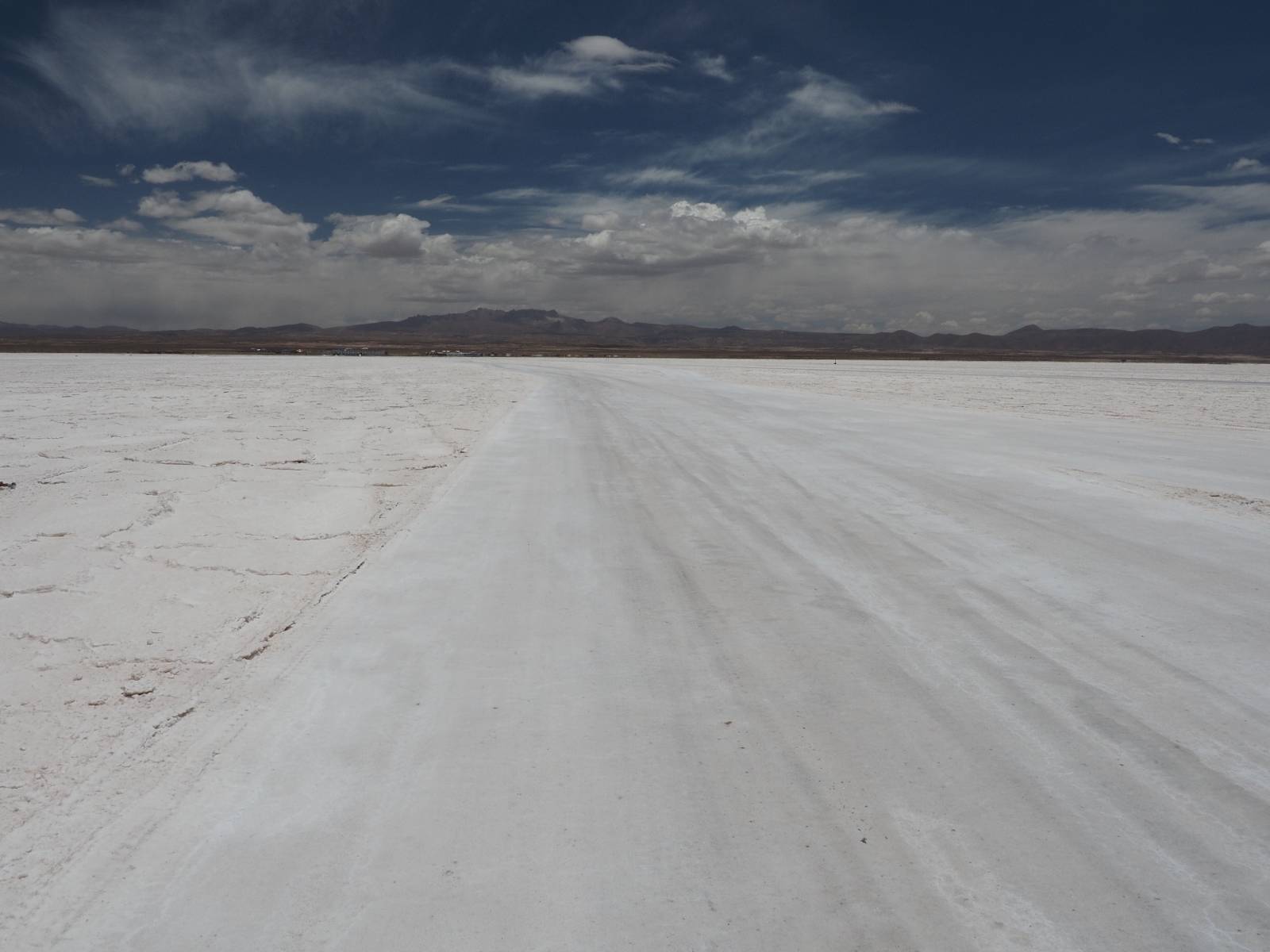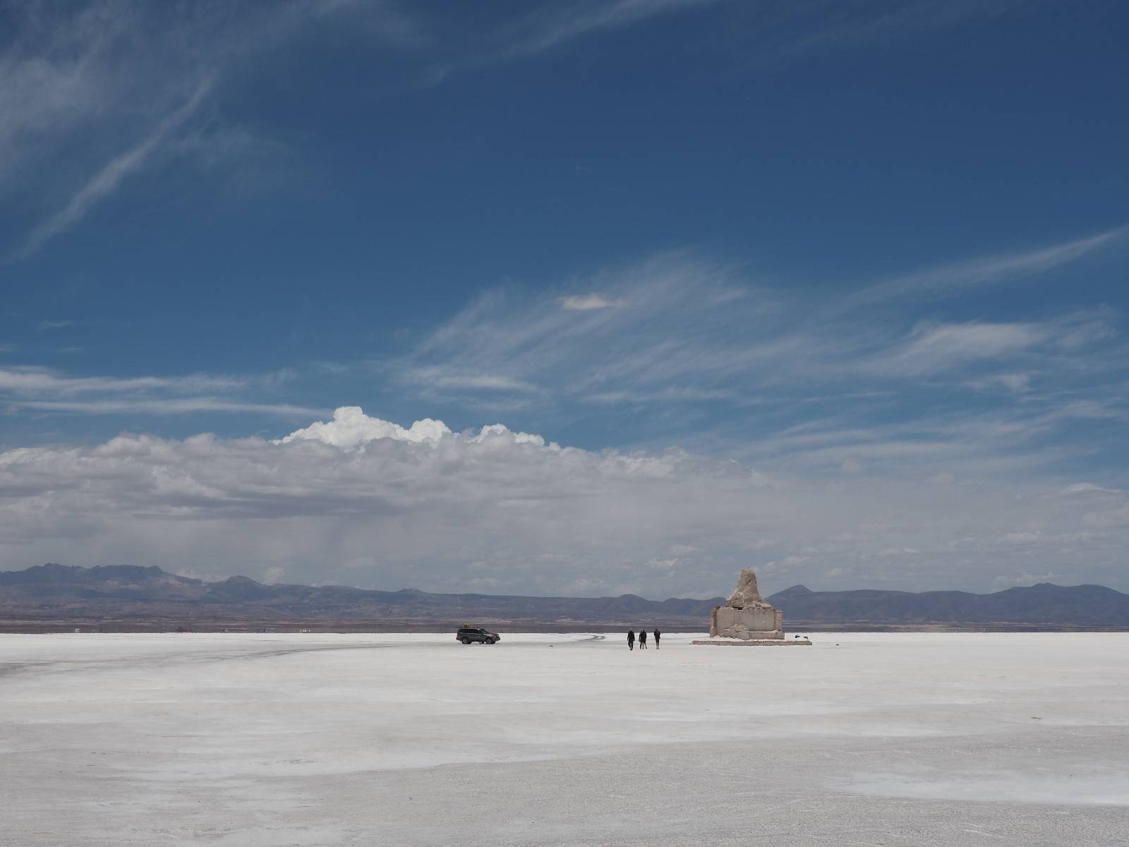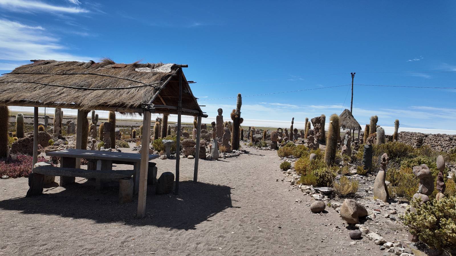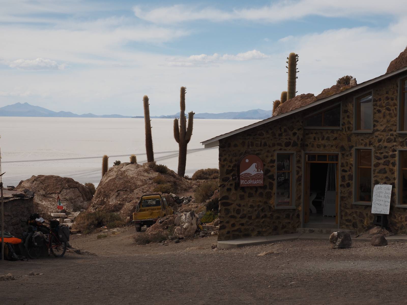 Ich packe wie gewöhnlich und fahre zum Salar de Uyuni. Der Einstieg befindet sich etwas nördlich im Örtchen Colchani. Dort fürt eine Piste auf den Salzsee, wo sich nach etwas Wirrwar die Pisten in verschieden Richtungen verteilen. Natürlich weiß mein Navi nicht wo ich hin will. Zumindest kennt es die Isla Incahuasi nicht! Erst als ich mit etwas hin und her zoomen die Isla im Display finde und diese als Koordinate angebe, habe ich das Gefühl, das mein Garmin dem dunklen Streifen, auf dem ich fahre folgt. Unglaublich! Es ist einfach unglaublich, einfach nur ganz viel Weiß um mich herum. Ok, es ist Anfang November und zu Hause sind die Blätter runter aber hier ballert die Sonne und es ist kein Schnee! Meine ersten beiden Stationen sind das Monumento al Dakar, das für die Dakar Rally steht, die zwischen 2014 und 2018 durch Bolivien führte. Da muss natürlich jeder Motorradfgahrer in Südamerika einmal gesewen sein! 😉 Und zum Plazas de las Banderas, der nur wenige Meter vom Dakar-Monument steht. Da das Dakar-Monument aus Salz besteht, war auch gerade ein Einer dabei, das Weiß um die Buchstaben neu zu beschichten. Einfach das Salz vom „See“ mit etwas Wasser mischen und als frischer neuer Putz drauf geklatscht! Ich blieb nicht dort in dem Salzhotel, sondern folgte nun dem lila Strich in meinem Navi, der nun einigermaßen zu dem „Schwarzen“ auf dem Salzsee passte zur Isla Incahuasi. Von nun an ca 80km einfach nur durchs Weiß! Irre absolut irre! Durch die Berge weit rings herum sieht man irgendwie einen Horizont, der aber nur bedingt näher kommt. Du fährst und hast das Gefühl leicht Berg auf zu fahren und dort hinten am Horizont geht es wieder runter. Und du denkst, ok bis dahin fahre ich und mache eine kleine Pause….aber nein, es ist immer so! Ich bleibe eigentlich immer auf 3665m Höhe und es ändert sich nichts, gar nichts. Ab und zu werde ich von Touri 4x4s überholt oder sie kommen mir entgegen! Und auch das ist ein kleines Schauspiel. Erst ein kleiner schwarzer Punkt am Horizont und dann schwupps an mir vorbei und wieder nur ein kleiner scharzer Punkt! Ich bin hin und weg! Am Anfang fahre ich noch vorsichtig. Es sieht aus wie eine fest gefahrene Schneedecke, die sich eisig spiegelt aber es ist wirklich griffig und bald gurke ich mit gemütlichen 80-90 über den Salar und genieße es einfach nur! Nach einer guten Stunde taucht die Isla Incahuasi auf. Ich fahre den ersten Zipfel an und staune über die riesigen Kakteen. Mal vorsichtig so einen Stachel zu berühren wird gleich mit einem Piekser quitiert! Gleich um die Ecke ist das Touristenzentrum. Ich hocke mich mit an den Kiosk, wo ich mit zwei Österreicherinnen und einem Itaiener ins Gespräch komme. Giovanni ist mit dem Fahrrad unterwegs, so wie einige andere, was ich wirklich bemerkenswert finde!! Alle Achtung! So wie ich will auch er die Nacht hier verbringen. Er weist mich darauf hin, dass er gegen 18:30 Uhr Abendbrot bestellt hat und meint ich solle doch auch mal fragen. Tue ich. Unser Abendbrot besteht aus Reis, mit einem Spiegelei und etwas klein geschnittenen Gurken und Tomaten. Giovanni hatte es schon einige Male probiert aber als die meisten Touristenautos weg sind und er einen neuen Versuch startet, bekommen wir eine kleine Kammer zum übernachten. Auf zwei Steinbänken mit Decken breiten wir unsere Schlafsäcke aus. Angeblich hatte er im Nebenzimmer „Mickey Mouse“ gesehen… Wir genießen bei einem Bier die Abendstimmung, die den Salar mit etwas Wolken in diversen pastell Farben für uns bereit hält. Eigentlich hatte ich ja das Zelt nehmen wollen, aber so wie der Wind bläst, war das vielleicht ganz gut so. Die Nacht ist soweit eigentlich in Ordnung. Ich hatte es mir schlimmer vorgestellt, von wegen diverser Geräusche. Gut ich habe meine Ohrstöpsel, damit beuge ich den meisten Lärmbelästigungen ganz gut vor. Am nächsten Morgen gibt es Frühstück um 08:30 Uhr. Ich muss Giovanni noch kurz aufklären, dass wir noch eine Stunde Zeit haben, da er von der Stunde mehr Zeitunterschied noch nicht wusste. Das Frühstück besteht aus ein paar Keksen, drei Scheiben Toast und für jeden ein Spiegelei! Giovanni hat Coca-Mate-Blätter zum Tee machen. Das soll gegen die Höhe helfen, so wie ich die Coca-Bonbon benutze. Nein, die machen nix! Ich habs ja nun ausprobiert, beides! Aber so ein bisschen gegen die Höhe helfen sie schon, nur wirklich merken tut man nichts. Mir geht es damit etwas normaler. „Oben“ muss ich schon etwas schnaufen, die Nase lässt gern auch etwas Blut raus und im Bauch ist es etwas nervöser. Das bessert sich dann. Aurelia 68 die uns das Frühstück serviert hat ist etwas verstimmt. Sie spricht immer davon, dass sie kein Brot und keine Butter hat. Wahrscheinlich kostet das Frühstück deswegen nicht sehr viel. Eigentlich nur einen Obulus. Ich spendiere Giovanni noch eine Banane bevor er sich aufs Fahrrad schwingt, dann radelt er davon. Ich nehme die andere Richtung zur Isla del Pescado. Ich genieße die Fahrt und biege auf Höhe der Isla zum rechten Ufer ab. James hatte mir ein kleines Museum empfolen mit ein paar Mumien vom alten Volk der Chullpas. Sie lebten dort noch vor den Incas also vor mehr al 1000 Jahjren. Das Museun ist klein, etwas eingestaubt aber ganz nett. Ich bekomme ein wenig zu den Ausstellungstücken erzählt und in einem kleine Kunst-Garten darf ich noch in eine nachgestellte Höle mit zwei echten Skeletten schauen. Was die sich bei meinem Anblick denken? Das Hotel gegenüber mutet sehr luxuriös an aber leider auch der Preis. Für nur einen Kurzaufenthalt hätte ich mir ein Zimmer mit Salzfußboden und Blick auf den Salar gegönnt. Der Tag ist noch nicht alt und so beschließe ich mich doch Richtung Grenze zu bewegen. Noch einmal über den Salar. Mittendrin, wo wieder nur die entfernten Berge den riesigen weißen Fleck auf der Karte umringhen mache ich einen Meditationsstop. Naja, ich hocke mich einfach nur daher, snacke ein wenig und genieße einfach nur das