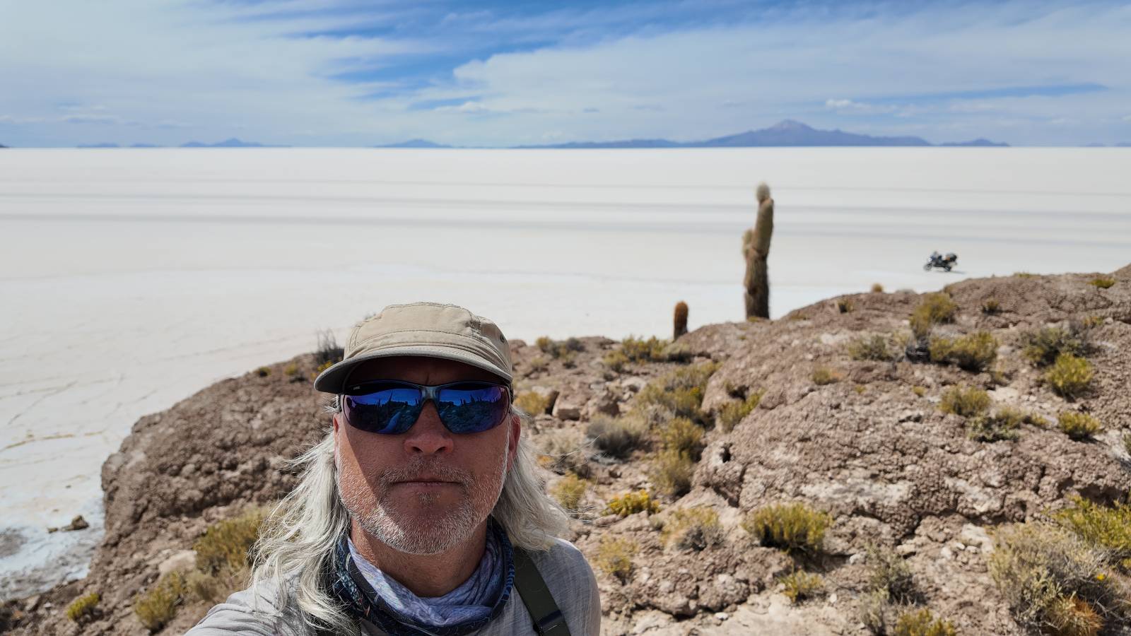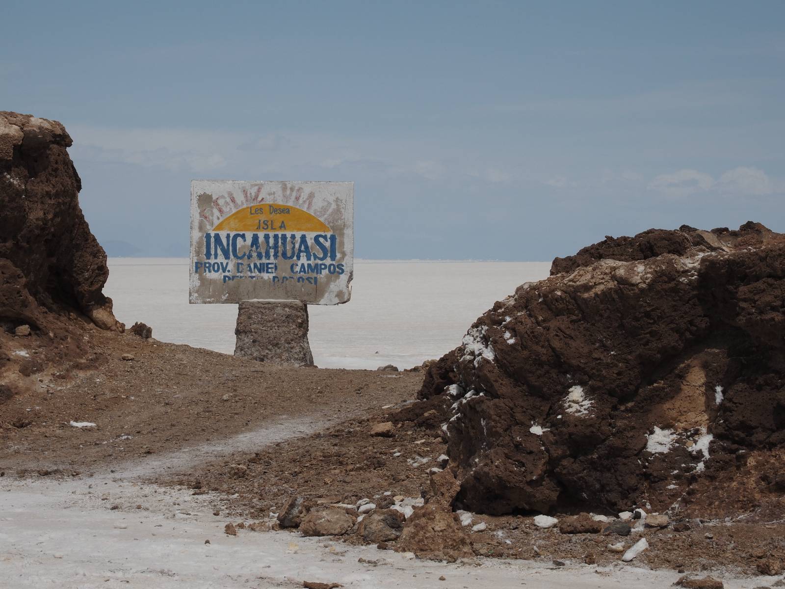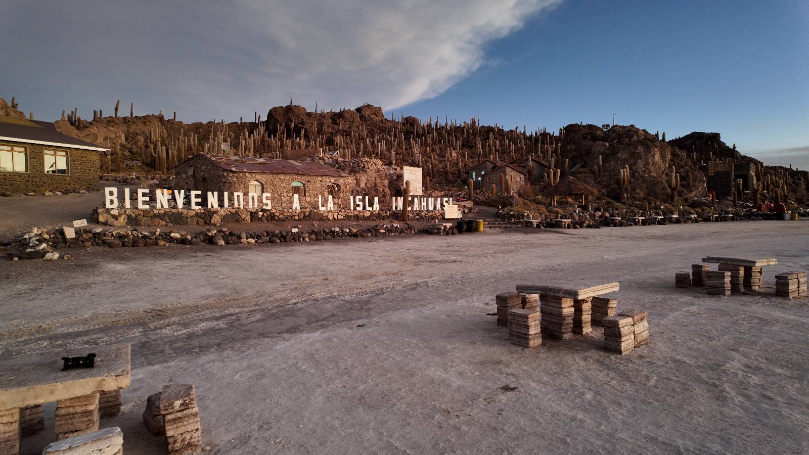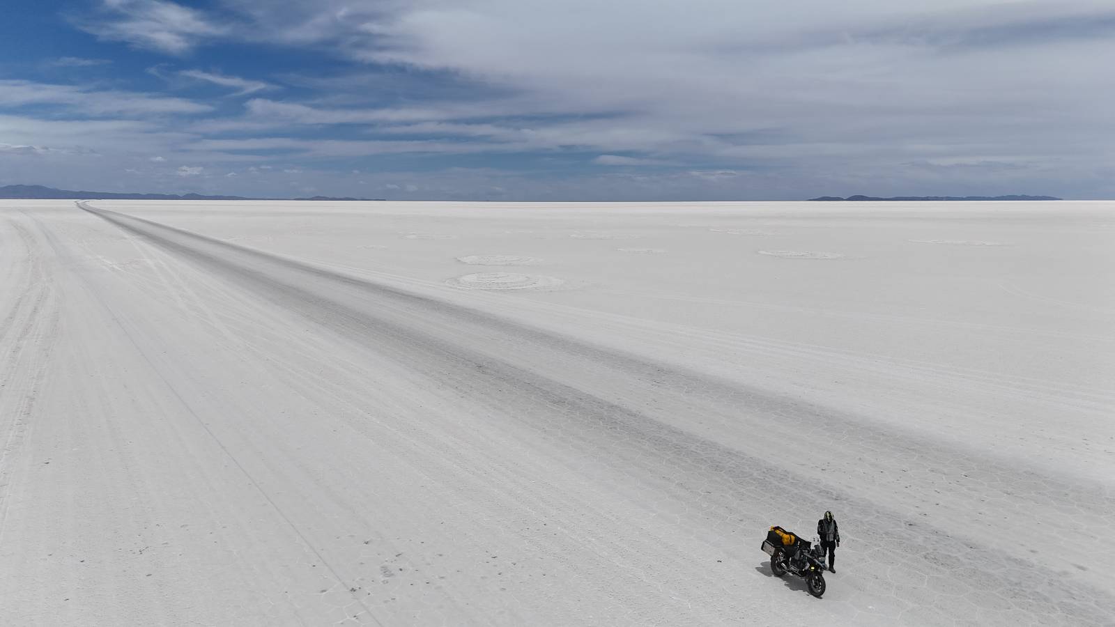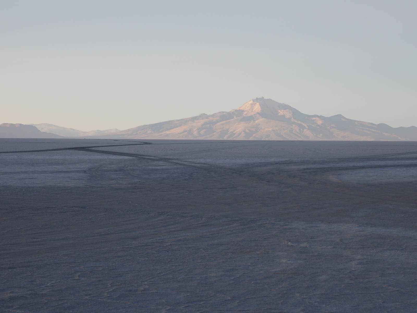Ich packe wie gewöhnlich und fahre zum Salar de Uyuni. Der Einstieg befindet sich etwas nördlich im Örtchen Colchani. Dort fürt eine Piste auf den Salzsee, wo sich nach etwas Wirrwar die Pisten in verschieden Richtungen verteilen. Natürlich weiß mein Navi nicht wo ich hin will. Zumindest kennt es die Isla Incahuasi nicht! Erst als ich mit etwas hin und her zoomen die Isla im Display finde und diese als Koordinate angebe, habe ich das Gefühl, das mein Garmin dem dunklen Streifen, auf dem ich fahre folgt. Unglaublich! Es ist einfach unglaublich, einfach nur ganz viel Weiß um mich herum. Ok, es ist Anfang November und zu Hause sind die Blätter runter aber hier ballert die Sonne und es ist kein Schnee! Meine ersten beiden Stationen sind das Monumento al Dakar, das für die Dakar Rally steht, die zwischen 2014 und 2018 durch Bolivien führte. Da muss natürlich jeder Motorradfgahrer in Südamerika einmal gesewen sein! 😉 Und zum Plazas de las Banderas, der nur wenige Meter vom Dakar-Monument steht. Da das Dakar-Monument aus Salz besteht, war auch gerade ein Einer dabei, das Weiß um die Buchstaben neu zu beschichten. Einfach das Salz vom „See“ mit etwas Wasser mischen und als frischer neuer Putz drauf geklatscht! Ich blieb nicht dort in dem Salzhotel, sondern folgte nun dem lila Strich in meinem Navi, der nun einigermaßen zu dem „Schwarzen“ auf dem Salzsee passte zur Isla Incahuasi. Von nun an ca 80km einfach nur durchs Weiß! Irre absolut irre! Durch die Berge weit rings herum sieht man irgendwie einen Horizont, der aber nur bedingt näher kommt. Du fährst und hast das Gefühl leicht Berg auf zu fahren und dort hinten am Horizont geht es wieder runter. Und du denkst, ok bis dahin fahre ich und mache eine kleine Pause….aber nein, es ist immer so! Ich bleibe eigentlich immer auf 3665m Höhe und es ändert sich nichts, gar nichts. Ab und zu werde ich von Touri 4x4s überholt oder sie kommen mir entgegen! Und auch das ist ein kleines Schauspiel. Erst ein kleiner schwarzer Punkt am Horizont und dann schwupps an mir vorbei und wieder nur ein kleiner scharzer Punkt! Ich bin hin und weg! Am Anfang fahre ich noch vorsichtig. Es sieht aus wie eine fest gefahrene Schneedecke, die sich eisig spiegelt aber es ist wirklich griffig und bald gurke ich mit gemütlichen 80-90 über den Salar und genieße es einfach nur! Nach einer guten Stunde taucht die Isla Incahuasi auf. Ich fahre den ersten Zipfel an und staune über die riesigen Kakteen. Mal vorsichtig so einen Stachel zu berühren wird gleich mit einem Piekser quitiert! Gleich um die Ecke ist das Touristenzentrum. Ich hocke mich mit an den Kiosk, wo ich mit zwei Österreicherinnen und einem Itaiener ins Gespräch komme. Giovanni ist mit dem Fahrrad unterwegs, so wie einige andere, was ich wirklich bemerkenswert finde!! Alle Achtung! So wie ich will auch er die Nacht hier verbringen. Er weist mich darauf hin, dass er gegen 18:30 Uhr Abendbrot bestellt hat und meint ich solle doch auch mal fragen. Tue ich. Unser Abendbrot besteht aus Reis, mit einem Spiegelei und etwas klein geschnittenen Gurken und Tomaten. Giovanni hatte es schon einige Male probiert aber als die meisten Touristenautos weg sind und er einen neuen Versuch startet, bekommen wir eine kleine Kammer zum übernachten. Auf zwei Steinbänken mit Decken breiten wir unsere Schlafsäcke aus. Angeblich hatte er im Nebenzimmer „Mickey Mouse“ gesehen… Wir genießen bei einem Bier die Abendstimmung, die den Salar mit etwas Wolken in diversen pastell Farben für uns bereit hält. Eigentlich hatte ich ja das Zelt nehmen wollen, aber so wie der Wind bläst, war das vielleicht ganz gut so. Die Nacht ist soweit eigentlich in Ordnung. Ich hatte es mir schlimmer vorgestellt, von wegen diverser Geräusche. Gut ich habe meine Ohrstöpsel, damit beuge ich den meisten Lärmbelästigungen ganz gut vor. Am nächsten Morgen gibt es Frühstück um 08:30 Uhr. Ich muss Giovanni noch kurz aufklären, dass wir noch eine Stunde Zeit haben, da er von der Stunde mehr Zeitunterschied noch nicht wusste. Das Frühstück besteht aus ein paar Keksen, drei Scheiben Toast und für jeden ein Spiegelei! Giovanni hat Coca-Mate-Blätter zum Tee machen. Das soll gegen die Höhe helfen, so wie ich die Coca-Bonbon benutze. Nein, die machen nix! Ich habs ja nun ausprobiert, beides! Aber so ein bisschen gegen die Höhe helfen sie schon, nur wirklich merken tut man nichts. Mir geht es damit etwas normaler. „Oben“ muss ich schon etwas schnaufen, die Nase lässt gern auch etwas Blut raus und im Bauch ist es etwas nervöser. Das bessert sich dann. Aurelia 68 die uns das Frühstück serviert hat ist etwas verstimmt. Sie spricht immer davon, dass sie kein Brot und keine Butter hat. Wahrscheinlich kostet das Frühstück deswegen nicht sehr viel. Eigentlich nur einen Obulus. Ich spendiere Giovanni noch eine Banane bevor er sich aufs Fahrrad schwingt, dann radelt er davon. Ich nehme die andere Richtung zur Isla del Pescado. Ich genieße die Fahrt und biege auf Höhe der Isla zum rechten Ufer ab. James hatte mir ein kleines Museum empfolen mit ein paar Mumien vom alten Volk der Chullpas. Sie lebten dort noch vor den Incas also vor mehr al 1000 Jahjren. Das Museun ist klein, etwas eingestaubt aber ganz nett. Ich bekomme ein wenig zu den Ausstellungstücken erzählt und in einem kleine Kunst-Garten darf ich noch in eine nachgestellte Höle mit zwei echten Skeletten schauen. Was die sich bei meinem Anblick denken? Das Hotel gegenüber mutet sehr luxuriös an aber leider auch der Preis. Für nur einen Kurzaufenthalt hätte ich mir ein Zimmer mit Salzfußboden und Blick auf den Salar gegönnt. Der Tag ist noch nicht alt und so beschließe ich mich doch Richtung Grenze zu bewegen. Noch einmal über den Salar. Mittendrin, wo wieder nur die entfernten Berge den riesigen weißen Fleck auf der Karte umringhen mache ich einen Meditationsstop. Naja, ich hocke mich einfach nur daher, snacke ein wenig und genieße einfach nur das