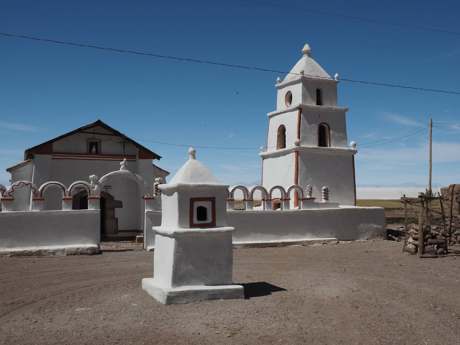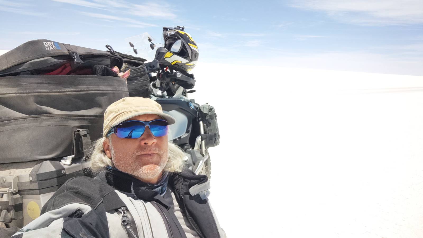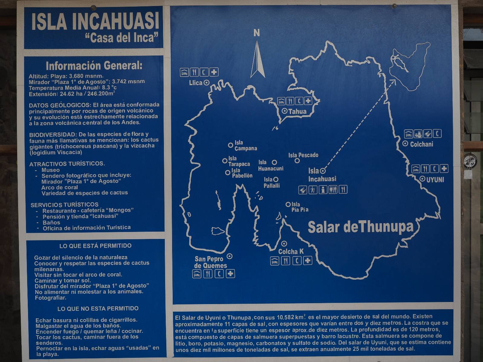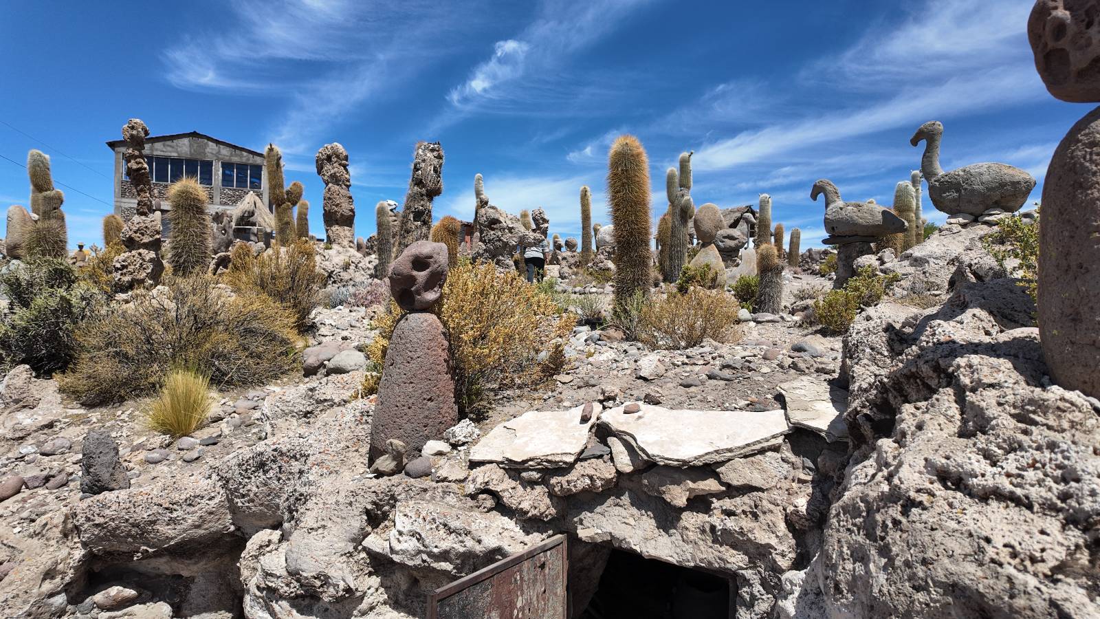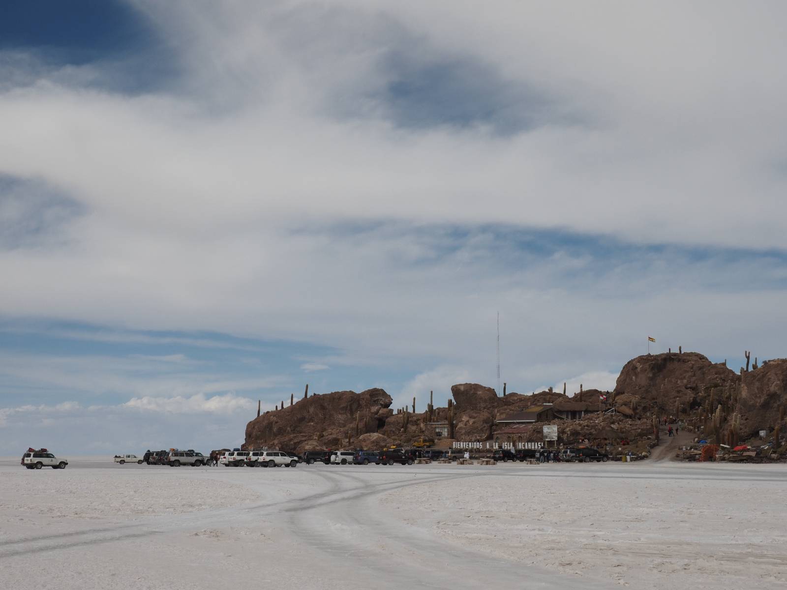 Ich packe wie gewöhnlich und fahre zum Salar de Uyuni. Der Einstieg befindet sich etwas nördlich im Örtchen Colchani. Dort fürt eine Piste auf den Salzsee, wo sich nach etwas Wirrwar die Pisten in verschieden Richtungen verteilen. Natürlich weiß mein Navi nicht wo ich hin will. Zumindest kennt es die Isla Incahuasi nicht! Erst als ich mit etwas hin und her zoomen die Isla im Display finde und diese als Koordinate angebe, habe ich das Gefühl, das mein Garmin dem dunklen Streifen, auf dem ich fahre folgt. Unglaublich! Es ist einfach unglaublich, einfach nur ganz viel Weiß um mich herum. Ok, es ist Anfang November und zu Hause sind die Blätter runter aber hier ballert die Sonne und es ist kein Schnee! Meine ersten beiden Stationen sind das Monumento al Dakar, das für die Dakar Rally steht, die zwischen 2014 und 2018 durch Bolivien führte. Da muss natürlich jeder Motorradfgahrer in Südamerika einmal gesewen sein! 😉 Und zum Plazas de las Banderas, der nur wenige Meter vom Dakar-Monument steht. Da das Dakar-Monument aus Salz besteht, war auch gerade ein Einer dabei, das Weiß um die Buchstaben neu zu beschichten. Einfach das Salz vom „See“ mit etwas Wasser mischen und als frischer neuer Putz drauf geklatscht! Ich blieb nicht dort in dem Salzhotel, sondern folgte nun dem lila Strich in meinem Navi, der nun einigermaßen zu dem „Schwarzen“ auf dem Salzsee passte zur Isla Incahuasi. Von nun an ca 80km einfach nur durchs Weiß! Irre absolut irre! Durch die Berge weit rings herum sieht man irgendwie einen Horizont, der aber nur bedingt näher kommt. Du fährst und hast das Gefühl leicht Berg auf zu fahren und dort hinten am Horizont geht es wieder runter. Und du denkst, ok bis dahin fahre ich und mache eine kleine Pause….aber nein, es ist immer so! Ich bleibe eigentlich immer auf 3665m Höhe und es ändert sich nichts, gar nichts. Ab und zu werde ich von Touri 4x4s überholt oder sie kommen mir entgegen! Und auch das ist ein kleines Schauspiel. Erst ein kleiner schwarzer Punkt am Horizont und dann schwupps an mir vorbei und wieder nur ein kleiner scharzer Punkt! Ich bin hin und weg! Am Anfang fahre ich noch vorsichtig. Es sieht aus wie eine fest gefahrene Schneedecke, die sich eisig spiegelt aber es ist wirklich griffig und bald gurke ich mit gemütlichen 80-90 über den Salar und genieße es einfach nur! Nach einer guten Stunde taucht die Isla Incahuasi auf. Ich fahre den ersten Zipfel an und staune über die riesigen Kakteen. Mal vorsichtig so einen Stachel zu berühren wird gleich mit einem Piekser quitiert! Gleich um die Ecke ist das Touristenzentrum. Ich hocke mich mit an den Kiosk, wo ich mit zwei Österreicherinnen und einem Itaiener ins Gespräch komme. Giovanni ist mit dem Fahrrad unterwegs, so wie einige andere, was ich wirklich bemerkenswert finde!! Alle Achtung! So wie ich will auch er die Nacht hier verbringen. Er weist mich darauf hin, dass er gegen 18:30 Uhr Abendbrot bestellt hat und meint ich solle doch auch mal fragen. Tue ich. Unser Abendbrot besteht aus Reis, mit einem Spiegelei und etwas klein geschnittenen Gurken und Tomaten. Giovanni hatte es schon einige Male probiert aber als die meisten Touristenautos weg sind und er einen neuen Versuch startet, bekommen wir eine kleine Kammer zum übernachten. Auf zwei Steinbänken mit Decken breiten wir unsere Schlafsäcke aus. Angeblich hatte er im Nebenzimmer „Mickey Mouse“ gesehen… Wir genießen bei einem Bier die Abendstimmung, die den Salar mit etwas Wolken in diversen pastell Farben für uns bereit hält. Eigentlich hatte ich ja das Zelt nehmen wollen, aber so wie der Wind bläst, war das vielleicht ganz gut so. Die Nacht ist soweit eigentlich in Ordnung. Ich hatte es mir schlimmer vorgestellt, von wegen diverser Geräusche. Gut ich habe meine Ohrstöpsel, damit beuge ich den meisten Lärmbelästigungen ganz gut vor. Am nächsten Morgen gibt es Frühstück um 08:30 Uhr. Ich muss Giovanni noch kurz aufklären, dass wir noch eine Stunde Zeit haben, da er von der Stunde mehr Zeitunterschied noch nicht wusste. Das Frühstück besteht aus ein paar Keksen, drei Scheiben Toast und für jeden ein Spiegelei! Giovanni hat Coca-Mate-Blätter zum Tee machen. Das soll gegen die Höhe helfen, so wie ich die Coca-Bonbon benutze. Nein, die machen nix! Ich habs ja nun ausprobiert, beides! Aber so ein bisschen gegen die Höhe helfen sie schon, nur wirklich merken tut man nichts. Mir geht es damit etwas normaler. „Oben“ muss ich schon etwas schnaufen, die Nase lässt gern auch etwas Blut raus und im Bauch ist es etwas nervöser. Das bessert sich dann. Aurelia 68 die uns das Frühstück serviert hat ist etwas verstimmt. Sie spricht immer davon, dass sie kein Brot und keine Butter hat. Wahrscheinlich kostet das Frühstück deswegen nicht sehr viel. Eigentlich nur einen Obulus. Ich spendiere Giovanni noch eine Banane bevor er sich aufs Fahrrad schwingt, dann radelt er davon. Ich nehme die andere Richtung zur Isla del Pescado. Ich genieße die Fahrt und biege auf Höhe der Isla zum rechten Ufer ab. James hatte mir ein kleines Museum empfolen mit ein paar Mumien vom alten Volk der Chullpas. Sie lebten dort noch vor den Incas also vor mehr al 1000 Jahjren. Das Museun ist klein, etwas eingestaubt aber ganz nett. Ich bekomme ein wenig zu den Ausstellungstücken erzählt und in einem kleine Kunst-Garten darf ich noch in eine nachgestellte Höle mit zwei echten Skeletten schauen. Was die sich bei meinem Anblick denken? Das Hotel gegenüber mutet sehr luxuriös an aber leider auch der Preis. Für nur einen Kurzaufenthalt hätte ich mir ein Zimmer mit Salzfußboden und Blick auf den Salar gegönnt. Der Tag ist noch nicht alt und so beschließe ich mich doch Richtung Grenze zu bewegen. Noch einmal über den Salar. Mittendrin, wo wieder nur die entfernten Berge den riesigen weißen Fleck auf der Karte umringhen mache ich einen Meditationsstop. Naja, ich hocke mich einfach nur daher, snacke ein wenig und genieße einfach nur das